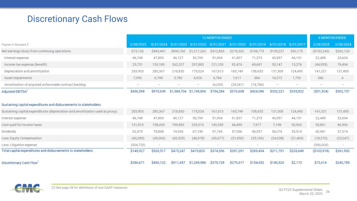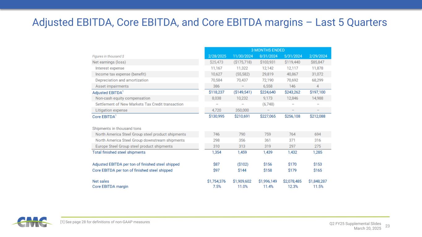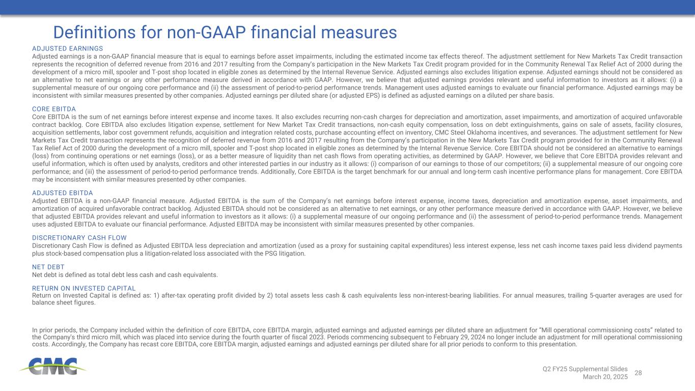 28 Definitions for non-GAAP financial measures ADJUSTED EARNINGS Adjusted earnings is a non-GAAP financial measure that is equal to earnings before asset impairments, including the estimated income tax effects thereof. The adjustment settlement for New Markets Tax Credit transaction represents the recognition of deferred revenue from 2016 and 2017 resulting from the Company’s participation in the New Markets Tax Credit program provided for in the Community Renewal Tax Relief Act of 2000 during the development of a micro mill, spooler and T-post shop located in eligible zones as determined by the Internal Revenue Service. Adjusted earnings also excludes litigation expense. Adjusted earnings should not be considered as an alternative to net earnings or any other performance measure derived in accordance with GAAP. However, we believe that adjusted earnings provides relevant and useful information to investors as it allows: (i) a supplemental measure of our ongoing core performance and (ii) the assessment of period-to-period performance trends. Management uses adjusted earnings to evaluate our financial performance. Adjusted earnings may be inconsistent with similar measures presented by other companies. Adjusted earnings per diluted share (or adjusted EPS) is defined as adjusted earnings on a diluted per share basis. CORE EBITDA Core EBITDA is the sum of net earnings before interest expense and income taxes. It also excludes recurring non-cash charges for depreciation and amortization, asset impairments, and amortization of acquired unfavorable contract backlog. Core EBITDA also excludes litigation expense, settlement for New Market Tax Credit transactions, non-cash equity compensation, loss on debt extinguishments, gains on sale of assets, facility closures, acquisition settlements, labor cost government refunds, acquisition and integration related costs, purchase accounting effect on inventory, CMC Steel Oklahoma incentives, and severances. The adjustment settlement for New Markets Tax Credit transaction represents the recognition of deferred revenue from 2016 and 2017 resulting from the Company’s participation in the New Markets Tax Credit program provided for in the Community Renewal Tax Relief Act of 2000 during the development of a micro mill, spooler and T-post shop located in eligible zones as determined by the Internal Revenue Service. Core EBITDA should not be considered an alternative to earnings (loss) from continuing operations or net earnings (loss), or as a better measure of liquidity than net cash flows from operating activities, as determined by GAAP. However, we believe that Core EBITDA provides relevant and useful information, which is often used by analysts, creditors and other interested parties in our industry as it allows: (i) comparison of our earnings to those of our competitors; (ii) a supplemental measure of our ongoing core performance; and (iii) the assessment of period-to-period performance trends. Additionally, Core EBITDA is the target benchmark for our annual and long-term cash incentive performance plans for management. Core EBITDA may be inconsistent with similar measures presented by other companies. ADJUSTED EBITDA Adjusted EBITDA is a non-GAAP financial measure. Adjusted EBITDA is the sum of the Company’s net earnings before interest expense, income taxes, depreciation and amortization expense, asset impairments, and amortization of acquired unfavorable contract backlog. Adjusted EBITDA should not be considered as an alternative to net earnings, or any other performance measure derived in accordance with GAAP. However, we believe that adjusted EBITDA provides relevant and useful information to investors as it allows: (i) a supplemental measure of our ongoing performance and (ii) the assessment of period-to-period performance trends. Management uses adjusted EBITDA to evaluate our financial performance. Adjusted EBITDA may be inconsistent with similar measures presented by other companies. DISCRETIONARY CASH FLOW Discretionary Cash Flow is defined as Adjusted EBITDA less depreciation and amortization (used as a proxy for sustaining capital expenditures) less interest expense, less net cash income taxes paid less dividend payments plus stock-based compensation plus a litigation-related loss associated with the PSG litigation. NET DEBT Net debt is defined as total debt less cash and cash equivalents. RETURN ON INVESTED CAPITAL Return on Invested Capital is defined as: 1) after-tax operating profit divided by 2) total assets less cash & cash equivalents less non-interest-bearing liabilities. For annual measures, trailing 5-quarter averages are used for balance sheet figures. In prior periods, the Company included within the definition of core EBITDA, core EBITDA margin, adjusted earnings and adjusted earnings per diluted share an adjustment for “Mill operational commissioning costs” related to the Company's third micro mill, which was placed into service during the fourth quarter of fiscal 2023. Periods commencing subsequent to February 29, 2024 no longer include an adjustment for mill operational commissioning costs. Accordingly, the Company has recast core EBITDA, core EBITDA margin, adjusted earnings and adjusted earnings per diluted share for all prior periods to conform to this presentation. Q2 FY25 Supplemental Slides March 20, 2025