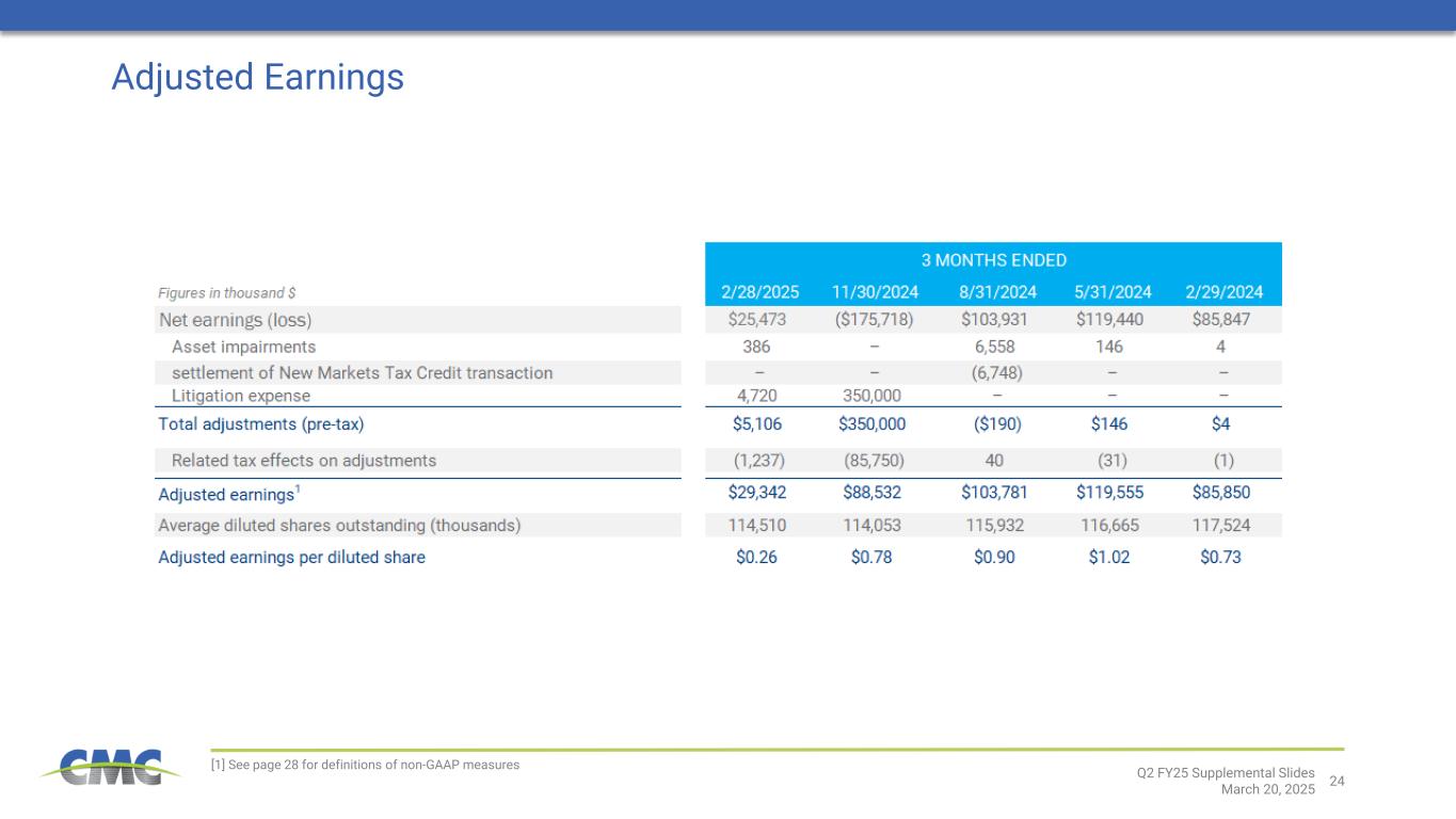 24 Adjusted Earnings [1] See page 28 for definitions of non-GAAP measures Q2 FY25 Supplemental Slides March 20, 2025