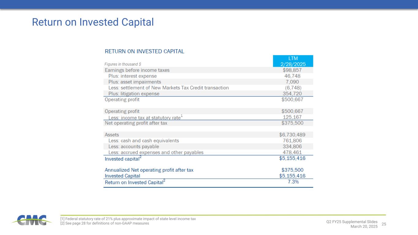 25 Return on Invested Capital [1] Federal statutory rate of 21% plus approximate impact of state level income tax [2] See page 28 for definitions of non-GAAP measures Q2 FY25 Supplemental Slides March 20, 2025