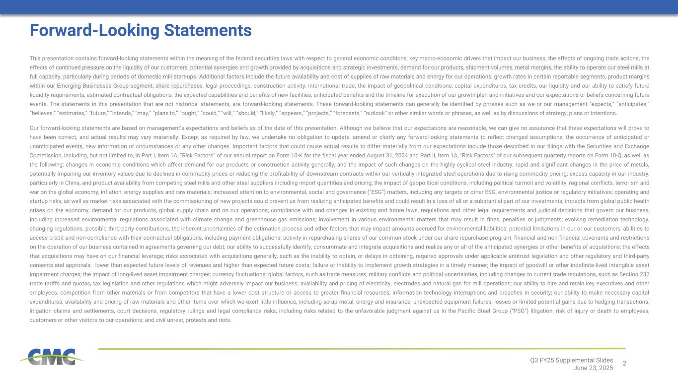 2Q3 FY25 Supplemental Slides June 23, 2025 This presentation contains forward-looking statements within the meaning of the federal securities laws with respect to general economic conditions, key macro-economic drivers that impact our business, the effects of ongoing trade actions, the effects of continued pressure on the liquidity of our customers, potential synergies and growth provided by acquisitions and strategic investments, demand for our products, shipment volumes, metal margins, the ability to operate our steel mills at full capacity, particularly during periods of domestic mill start-ups. Additional factors include the future availability and cost of supplies of raw materials and energy for our operations, growth rates in certain reportable segments, product margins within our Emerging Businesses Group segment, share repurchases, legal proceedings, construction activity, international trade, the impact of geopolitical conditions, capital expenditures, tax credits, our liquidity and our ability to satisfy future liquidity requirements, estimated contractual obligations, the expected capabilities and benefits of new facilities, anticipated benefits and the timeline for execution of our growth plan and initiatives and our expectations or beliefs concerning future events. The statements in this presentation that are not historical statements, are forward-looking statements. These forward-looking statements can generally be identified by phrases such as we or our management “expects,” “anticipates,” “believes,” “estimates,” “future,” “intends,” “may,” “plans to,” “ought,” “could,” “will,” “should,” “likely,” “appears,” “projects,” “forecasts,” “outlook” or other similar words or phrases, as well as by discussions of strategy, plans or intentions. Our forward-looking statements are based on management’s expectations and beliefs as of the date of this presentation. Although we believe that our expectations are reasonable, we can give no assurance that these expectations will prove to have been correct, and actual results may vary materially. Except as required by law, we undertake no obligation to update, amend or clarify any forward-looking statements to reflect changed assumptions, the occurrence of anticipated or unanticipated events, new information or circumstances or any other changes. Important factors that could cause actual results to differ materially from our expectations include those described in our filings with the Securities and Exchange Commission, including, but not limited to, in Part I, Item 1A, “Risk Factors” of our annual report on Form 10-K for the fiscal year ended August 31, 2024 and Part II, Item 1A, "Risk Factors" of our subsequent quarterly reports on Form 10-Q, as well as the following: changes in economic conditions which affect demand for our products or construction activity generally, and the impact of such changes on the highly cyclical steel industry; rapid and significant changes in the price of metals, potentially impairing our inventory values due to declines in commodity prices or reducing the profitability of downstream contracts within our vertically integrated steel operations due to rising commodity pricing; excess capacity in our industry, particularly in China, and product availability from competing steel mills and other steel suppliers including import quantities and pricing; the impact of geopolitical conditions, including political turmoil and volatility, regional conflicts, terrorism and war on the global economy, inflation, energy supplies and raw materials; increased attention to environmental, social and governance (“ESG”) matters, including any targets or other ESG, environmental justice or regulatory initiatives; operating and startup risks, as well as market risks associated with the commissioning of new projects could prevent us from realizing anticipated benefits and could result in a loss of all or a substantial part of our investments; impacts from global public health crises on the economy, demand for our products, global supply chain and on our operations; compliance with and changes in existing and future laws, regulations and other legal requirements and judicial decisions that govern our business, including increased environmental regulations associated with climate change and greenhouse gas emissions; involvement in various environmental matters that may result in fines, penalties or judgments; evolving remediation technology, changing regulations, possible third-party contributions, the inherent uncertainties of the estimation process and other factors that may impact amounts accrued for environmental liabilities; potential limitations in our or our customers' abilities to access credit and non-compliance with their contractual obligations, including payment obligations; activity in repurchasing shares of our common stock under our share repurchase program; financial and non-financial covenants and restrictions on the operation of our business contained in agreements governing our debt; our ability to successfully identify, consummate and integrate acquisitions and realize any or all of the anticipated synergies or other benefits of acquisitions; the effects that acquisitions may have on our financial leverage; risks associated with acquisitions generally, such as the inability to obtain, or delays in obtaining, required approvals under applicable antitrust legislation and other regulatory and third-party consents and approvals; lower than expected future levels of revenues and higher than expected future costs; failure or inability to implement growth strategies in a timely manner; the impact of goodwill or other indefinite-lived intangible asset impairment charges; the impact of long-lived asset impairment charges; currency fluctuations; global factors, such as trade measures, military conflicts and political uncertainties, including change