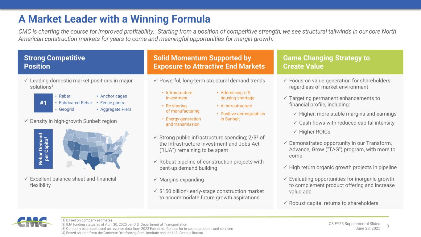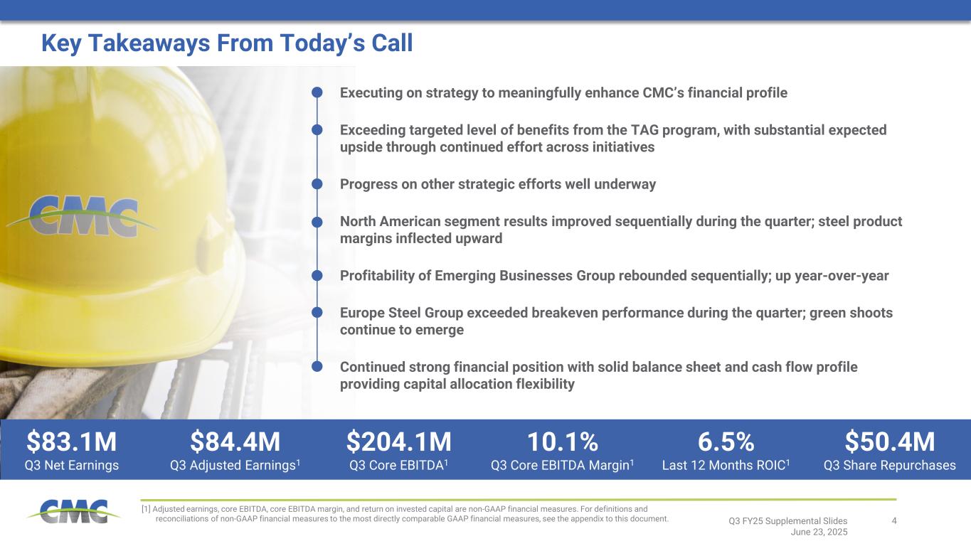 4Q3 FY25 Supplemental Slides June 23, 2025 [1] Adjusted earnings, core EBITDA, core EBITDA margin, and return on invested capital are non-GAAP financial measures. For definitions and reconciliations of non-GAAP financial measures to the most directly comparable GAAP financial measures, see the appendix to this document. Key Takeaways From Today’s Call Executing on strategy to meaningfully enhance CMC’s financial profile Exceeding targeted level of benefits from the TAG program, with substantial expected upside through continued effort across initiatives Progress on other strategic efforts well underway North American segment results improved sequentially during the quarter; steel product margins inflected upward Profitability of Emerging Businesses Group rebounded sequentially; up year-over-year Europe Steel Group exceeded breakeven performance during the quarter; green shoots continue to emerge Continued strong financial position with solid balance sheet and cash flow profile providing capital allocation flexibility $83.1M Q3 Net Earnings $84.4M Q3 Adjusted Earnings1 $204.1M Q3 Core EBITDA1 10.1% Q3 Core EBITDA Margin1 6.5% Last 12 Months ROIC1 $50.4M Q3 Share Repurchases