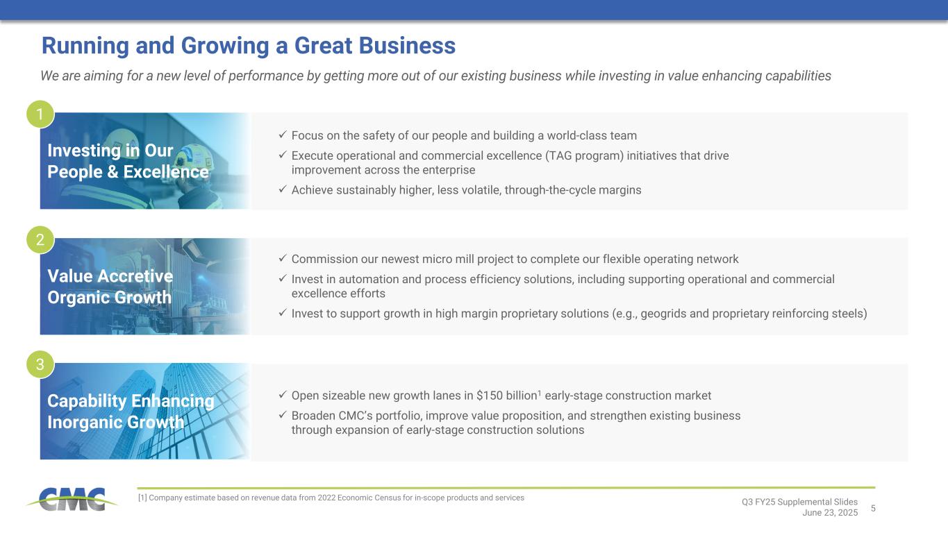 3 © GeoNames, Microsoft, TomTom Powered by Bing A Market Leader with a Winning Formula CMC is charting the course for improved profitability. Starting from a position of competitive strength, we see structural tailwinds in our core North American construction markets for years to come and meaningful opportunities for margin growth. Strong Competitive Position Solid Momentum Supported by Exposure to Attractive End Markets Game Changing Strategy to Create Value  Leading domestic market positions in major solutions1  Density in high-growth Sunbelt region  Excellent balance sheet and financial flexibility #1 • Rebar • Fabricated Rebar • Geogrid • Anchor cages • Fence posts • Aggregate Piers Re ba r D em an d pe r C ap ita 4  Powerful, long-term structural demand trends  Strong public infrastructure spending; 2/32 of the Infrastructure Investment and Jobs Act (“IIJA”) remaining to be spent  Robust pipeline of construction projects with pent-up demand building  Margins expanding  $150 billion3 early-stage construction market to accommodate future growth aspirations • Infrastructure investment • Re-shoring of manufacturing • Energy generation and transmission • Addressing U.S. housing shortage • AI infrastructure • Positive demographics in Sunbelt  Focus on value generation for shareholders regardless of market environment  Targeting permanent enhancements to financial profile, including:  Higher, more stable margins and earnings  Cash flows with reduced capital intensity  Higher ROICs Q3 FY25 Supplemental Slides June 23, 2025  Demonstrated opportunity in our Transform, Advance, Grow ("TAG") program, with more to come  High return organic growth projects in pipeline  Evaluating opportunities for inorganic growth to complement product offering and increase value add  Robust capital returns to shareholders [1] Based on company estimates [2] IIJA funding status as of April 30, 2025 per U.S. Department of Transportation [3] Company estimate based on revenue data from 2022 Economic Census for in-scope products and services [4] Based on data from the Concrete Reinforcing Steel Institute and the U.S. Census Bureau