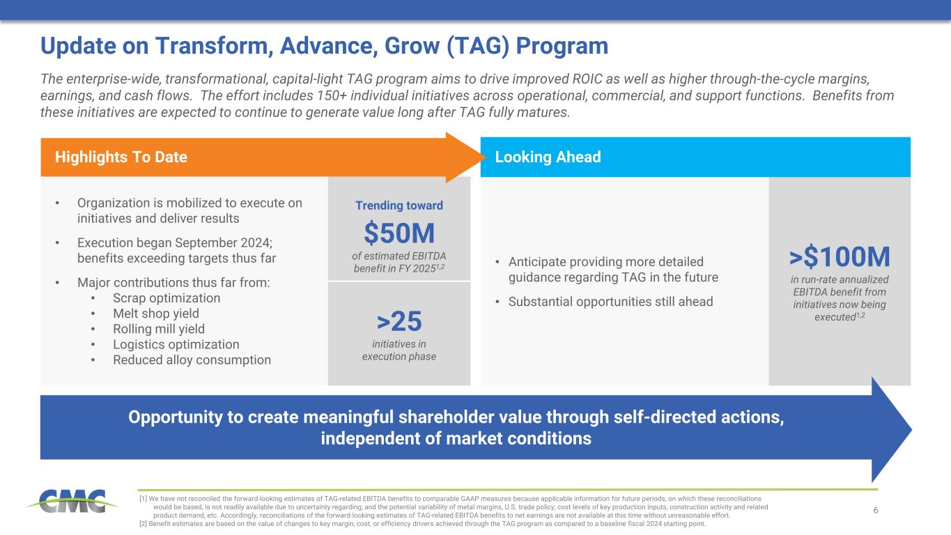 5 Running and Growing a Great Business Q3 FY25 Supplemental Slides June 23, 2025 We are aiming for a new level of performance by getting more out of our existing business while investing in value enhancing capabilities Investing in Our People & Excellence Value Accretive Organic Growth Capability Enhancing Inorganic Growth 1 2 3  Focus on the safety of our people and building a world-class team  Execute operational and commercial excellence (TAG program) initiatives that drive improvement across the enterprise  Achieve sustainably higher, less volatile, through-the-cycle margins  Commission our newest micro mill project to complete our flexible operating network  Invest in automation and process efficiency solutions, including supporting operational and commercial excellence efforts  Invest to support growth in high margin proprietary solutions (e.g., geogrids and proprietary reinforcing steels)  Open sizeable new growth lanes in $150 billion1 early-stage construction market  Broaden CMC’s portfolio, improve value proposition, and strengthen existing business through expansion of early-stage construction solutions [1] Company estimate based on revenue data from 2022 Economic Census for in-scope products and services