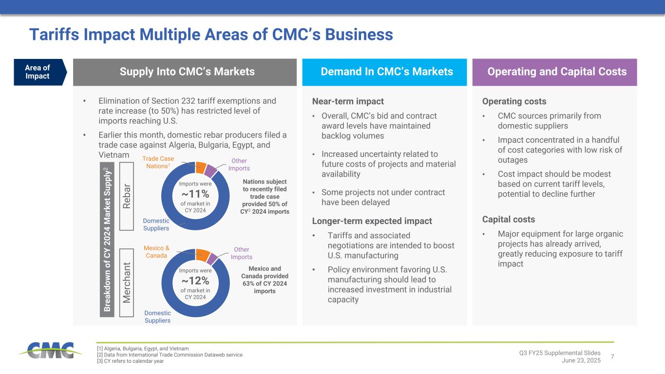 6 Update on Transform, Advance, Grow (TAG) Program The enterprise-wide, transformational, capital-light TAG program aims to drive improved ROIC as well as higher through-the-cycle margins, earnings, and cash flows. The effort includes 150+ individual initiatives across operational, commercial, and support functions. Benefits from these initiatives are expected to continue to generate value long after TAG fully matures. Opportunity to create meaningful shareholder value through self-directed actions, independent of market conditions Looking AheadHighlights To Date • Organization is mobilized to execute on initiatives and deliver results • Execution began September 2024; benefits exceeding targets thus far • Major contributions thus far from: • Scrap optimization • Melt shop yield • Rolling mill yield • Logistics optimization • Reduced alloy consumption Trending toward $50M of estimated EBITDA benefit in FY 20251,2 >25 initiatives in execution phase • Anticipate providing more detailed guidance regarding TAG in the future • Substantial opportunities still ahead >$100M in run-rate annualized EBITDA benefit from initiatives now being executed1,2 [1] We have not reconciled the forward-looking estimates of TAG-related EBITDA benefits to comparable GAAP measures because applicable information for future periods, on which these reconciliations would be based, is not readily available due to uncertainty regarding, and the potential variability of metal margins, U.S. trade policy, cost levels of key production inputs, construction activity and related product demand, etc. Accordingly, reconciliations of the forward-looking estimates of TAG-related EBITDA benefits to net earnings are not available at this time without unreasonable effort. [2] Benefit estimates are based on the value of changes to key margin, cost, or efficiency drivers achieved through the TAG program as compared to a baseline fiscal 2024 starting point.