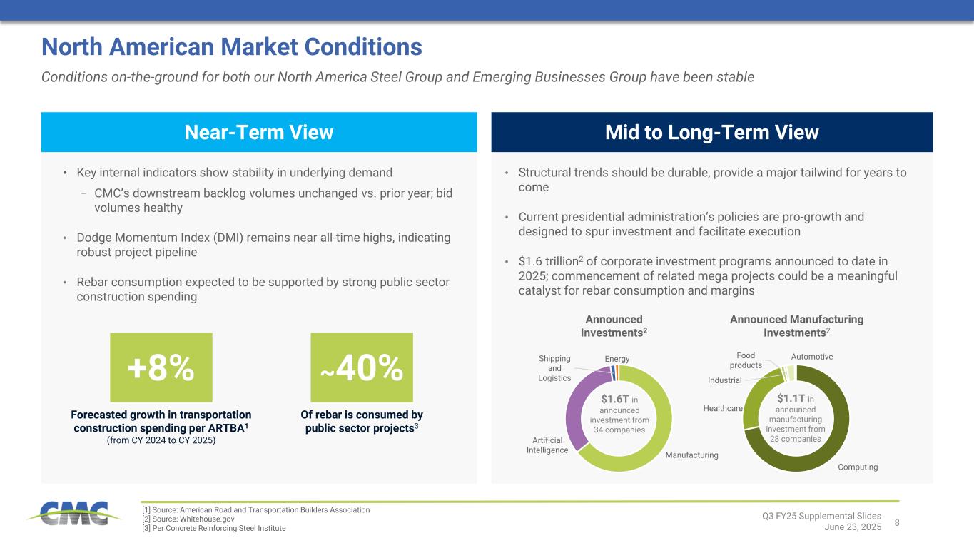 7 • Elimination of Section 232 tariff exemptions and rate increase (to 50%) has restricted level of imports reaching U.S. • Earlier this month, domestic rebar producers filed a trade case against Algeria, Bulgaria, Egypt, and Vietnam Mexico & Canada Other Imports Domestic Suppliers Trade Case Nations1 Other Imports Domestic Suppliers Tariffs Impact Multiple Areas of CMC’s Business Near-term impact • Overall, CMC’s bid and contract award levels have maintained backlog volumes • Increased uncertainty related to future costs of projects and material availability • Some projects not under contract have been delayed Longer-term expected impact • Tariffs and associated negotiations are intended to boost U.S. manufacturing • Policy environment favoring U.S. manufacturing should lead to increased investment in industrial capacity Operating costs • CMC sources primarily from domestic suppliers • Impact concentrated in a handful of cost categories with low risk of outages • Cost impact should be modest based on current tariff levels, potential to decline further Capital costs • Major equipment for large organic projects has already arrived, greatly reducing exposure to tariff impact Supply Into CMC’s Markets Demand In CMC’s Markets Operating and Capital Costs Br ea kd ow n of C Y 20 24 M ar ke t S up pl y2 Re ba r M er ch an t Area of Impact Q3 FY25 Supplemental Slides June 23, 2025 Nations subject to recently filed trade case provided 50% of CY3 2024 imports Imports were ~11% of market in CY 2024 Imports were ~12% of market in CY 2024 Mexico and Canada provided 63% of CY 2024 imports [1] Algeria, Bulgaria, Egypt, and Vietnam [2] Data from International Trade Commission Dataweb service [3] CY refers to calendar year