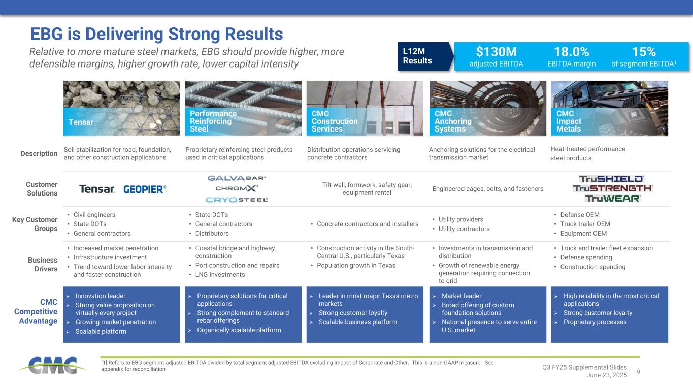 8 North American Market Conditions Q3 FY25 Supplemental Slides June 23, 2025 [1] Source: American Road and Transportation Builders Association [2] Source: Whitehouse.gov [3] Per Concrete Reinforcing Steel Institute Conditions on-the-ground for both our North America Steel Group and Emerging Businesses Group have been stable Near-Term View Mid to Long-Term View • Key internal indicators show stability in underlying demand − CMC’s downstream backlog volumes unchanged vs. prior year; bid volumes healthy • Dodge Momentum Index (DMI) remains near all-time highs, indicating robust project pipeline • Rebar consumption expected to be supported by strong public sector construction spending Forecasted growth in transportation construction spending per ARTBA1 (from CY 2024 to CY 2025) ~40% Of rebar is consumed by public sector projects3 • Structural trends should be durable, provide a major tailwind for years to come • Current presidential administration’s policies are pro-growth and designed to spur investment and facilitate execution • $1.6 trillion2 of corporate investment programs announced to date in 2025; commencement of related mega projects could be a meaningful catalyst for rebar consumption and margins Manufacturing Artificial Intelligence Shipping and Logistics Energy $1.6T in announced investment from 34 companies Announced Investments2 Computing Healthcare Industrial Food products Automotive Announced Manufacturing Investments2 $1.1T in announced manufacturing investment from 28 companies +8%