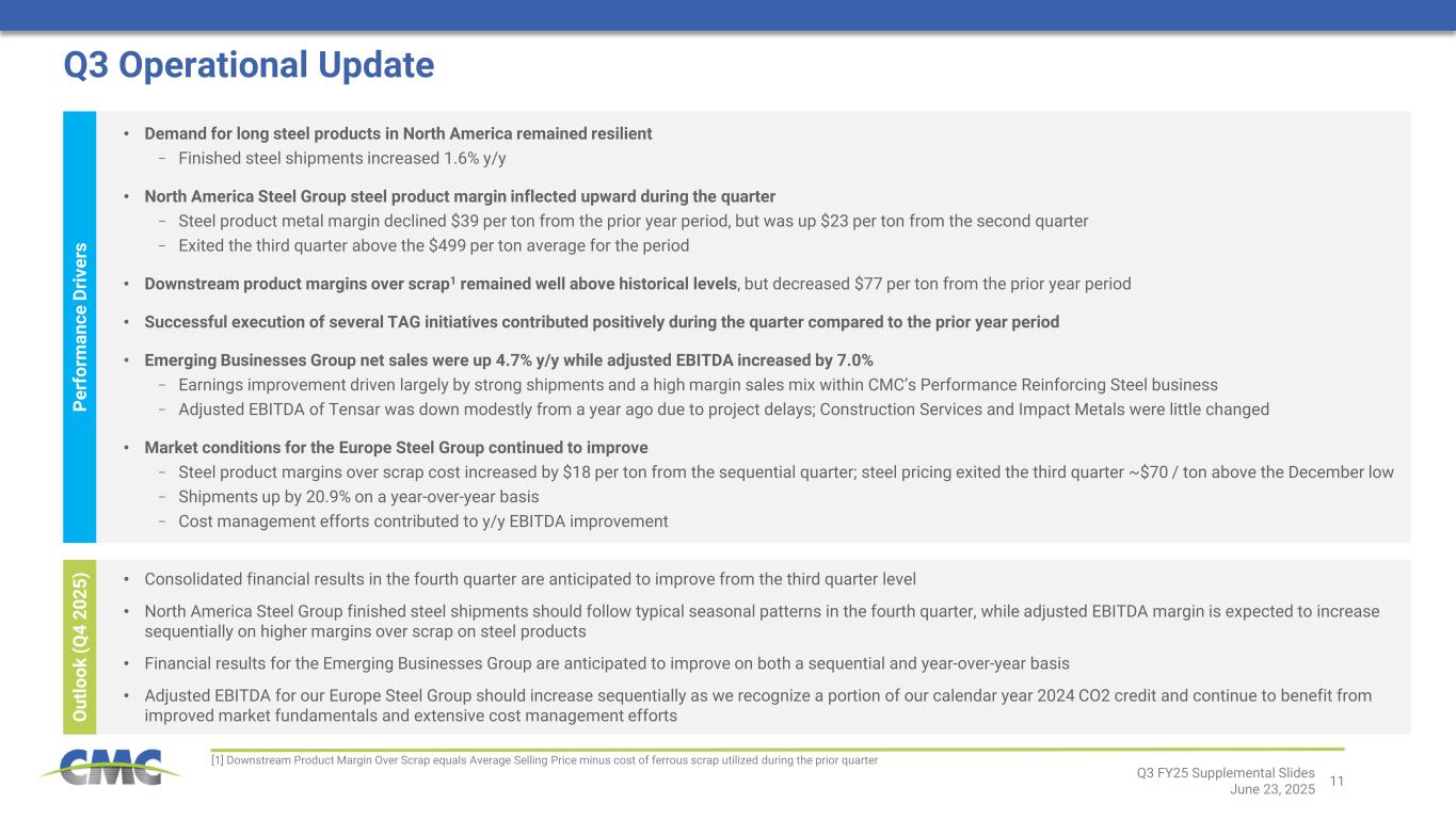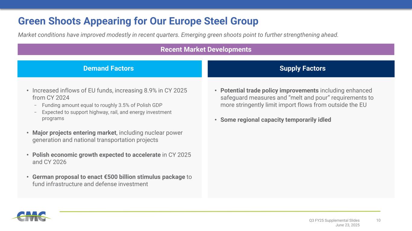 10Q3 FY25 Supplemental Slides June 23, 2025 Demand Factors Recent Market Developments • Increased inflows of EU funds, increasing 8.9% in CY 2025 from CY 2024 − Funding amount equal to roughly 3.5% of Polish GDP − Expected to support highway, rail, and energy investment programs • Major projects entering market, including nuclear power generation and national transportation projects • Polish economic growth expected to accelerate in CY 2025 and CY 2026 • German proposal to enact €500 billion stimulus package to fund infrastructure and defense investment Supply Factors • Potential trade policy improvements including enhanced safeguard measures and “melt and pour” requirements to more stringently limit import flows from outside the EU • Some regional capacity temporarily idled Green Shoots Appearing for Our Europe Steel Group Market conditions have improved modestly in recent quarters. Emerging green shoots point to further strengthening ahead.
