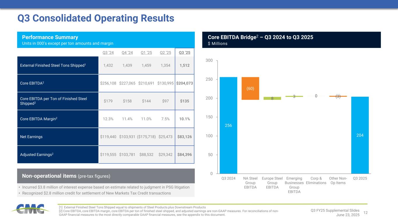 11 • Consolidated financial results in the fourth quarter are anticipated to improve from the third quarter level • North America Steel Group finished steel shipments should follow typical seasonal patterns in the fourth quarter, while adjusted EBITDA margin is expected to increase sequentially on higher margins over scrap on steel products • Financial results for the Emerging Businesses Group are anticipated to improve on both a sequential and year-over-year basis • Adjusted EBITDA for our Europe Steel Group should increase sequentially as we recognize a portion of our calendar year 2024 CO2 credit and continue to benefit from improved market fundamentals and extensive cost management efforts • Demand for long steel products in North America remained resilient − Finished steel shipments increased 1.6% y/y • North America Steel Group steel product margin inflected upward during the quarter − Steel product metal margin declined $39 per ton from the prior year period, but was up $23 per ton from the second quarter − Exited the third quarter above the $499 per ton average for the period • Downstream product margins over scrap1 remained well above historical levels, but decreased $77 per ton from the prior year period • Successful execution of several TAG initiatives contributed positively during the quarter compared to the prior year period • Emerging Businesses Group net sales were up 4.7% y/y while adjusted EBITDA increased by 7.0% − Earnings improvement driven largely by strong shipments and a high margin sales mix within CMC’s Performance Reinforcing Steel business − Adjusted EBITDA of Tensar was down modestly from a year ago due to project delays; Construction Services and Impact Metals were little changed • Market conditions for the Europe Steel Group continued to improve − Steel product margins over scrap cost increased by $18 per ton from the sequential quarter; steel pricing exited the third quarter ~$70 / ton above the December low − Shipments up by 20.9% on a year-over-year basis − Cost management efforts contributed to y/y EBITDA improvement Pe rf or m an ce D riv er s O ut lo ok (Q 4 20 25 ) Q3 Operational Update [1] Downstream Product Margin Over Scrap equals Average Selling Price minus cost of ferrous scrap utilized during the prior quarter Q3 FY25 Supplemental Slides June 23, 2025