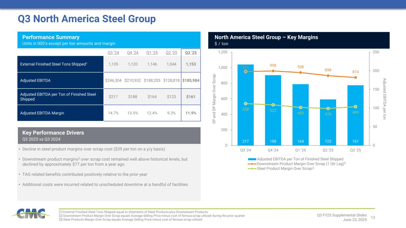 12 256 204 (60) 8 3 0 (3) 0 50 100 150 200 250 300 Q3 2024 NA Steel Group EBITDA Europe Steel Group EBITDA Emerging Businesses Group EBITDA Corp & Eliminations Other Non- Op Items Q3 2025 Q3 Consolidated Operating Results Q3 ’24 Q4 ’24 Q1 ’25 Q2 ’25 Q3 ’25 External Finished Steel Tons Shipped1 1,432 1,439 1,459 1,354 1,512 Core EBITDA2 $256,108 $227,065 $210,691 $130,995 $204,073 Core EBITDA per Ton of Finished Steel Shipped2 $179 $158 $144 $97 $135 Core EBITDA Margin2 12.3% 11.4% 11.0% 7.5% 10.1% Net Earnings $119,440 $103,931 ($175,718) $25,473 $83,126 Adjusted Earnings2 $119,555 $103,781 $88,532 $29,342 $84,396 Performance Summary Units in 000’s except per ton amounts and margin • Incurred $3.8 million of interest expense based on estimate related to judgment in PSG litigation • Recognized $2.8 million credit for settlement of New Markets Tax Credit transactions Non-operational items (pre-tax figures) [1] External Finished Steel Tons Shipped equal to shipments of Steel Products plus Downstream Products [2] Core EBITDA, core EBITDA margin, core EBITDA per ton of finished steel shipped, and adjusted earnings are non-GAAP measures. For reconciliations of non- GAAP financial measures to the most directly comparable GAAP financial measures, see the appendix to this document. Core EBITDA Bridge2 – Q3 2024 to Q3 2025 $ Millions Q3 FY25 Supplemental Slides June 23, 2025