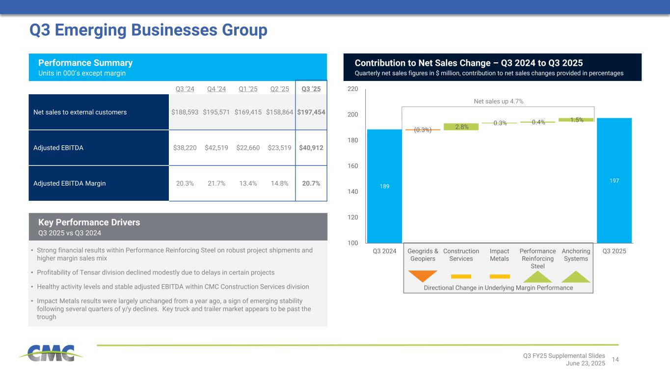 13 217 188 164 123 161 951 958 938 898 874 538 522 489 476 499 0 50 100 150 200 250 0 200 400 600 800 1,000 1,200 Q3 '24 Q4 '24 Q1 '25 Q2 '25 Q3 '25 Adjusted EBITDA per Ton of Finished Steel Shipped Downstream Product Margin Over Scrap (1 Qtr Lag) Steel Product Margin Over Scrap Q3 North America Steel Group Q3 ’24 Q4 ’24 Q1 ’25 Q2 ’25 Q3 ’25 External Finished Steel Tons Shipped1 1,135 1,120 1,146 1,044 1,153 Adjusted EBITDA $246,304 $210,932 $188,205 $128,818 $185,984 Adjusted EBITDA per Ton of Finished Steel Shipped $217 $188 $164 $123 $161 Adjusted EBITDA Margin 14.7% 13.5% 12.4% 9.3% 11.9% Performance Summary Units in 000’s except per ton amounts and margin • Decline in steel product margins over scrap cost ($39 per ton on a y/y basis) • Downstream product margins2 over scrap cost remained well above historical levels, but declined by approximately $77 per ton from a year ago • TAG related benefits contributed positively relative to the prior year • Additional costs were incurred related to unscheduled downtime at a handful of facilities [1] External Finished Steel Tons Shipped equal to shipments of Steel Products plus Downstream Products [2] Downstream Product Margin Over Scrap equals Average Selling Price minus cost of ferrous scrap utilized during the prior quarter [3] Steel Products Margin Over Scrap equals Average Selling Price minus cost of ferrous scrap utilized Q3 FY25 Supplemental Slides June 23, 2025 North America Steel Group – Key Margins $ / ton SP a nd D P M ar gi n O ve r S cr ap Adjusted EBITDA per ton 2 3 Key Performance Drivers Q3 2025 vs Q3 2024