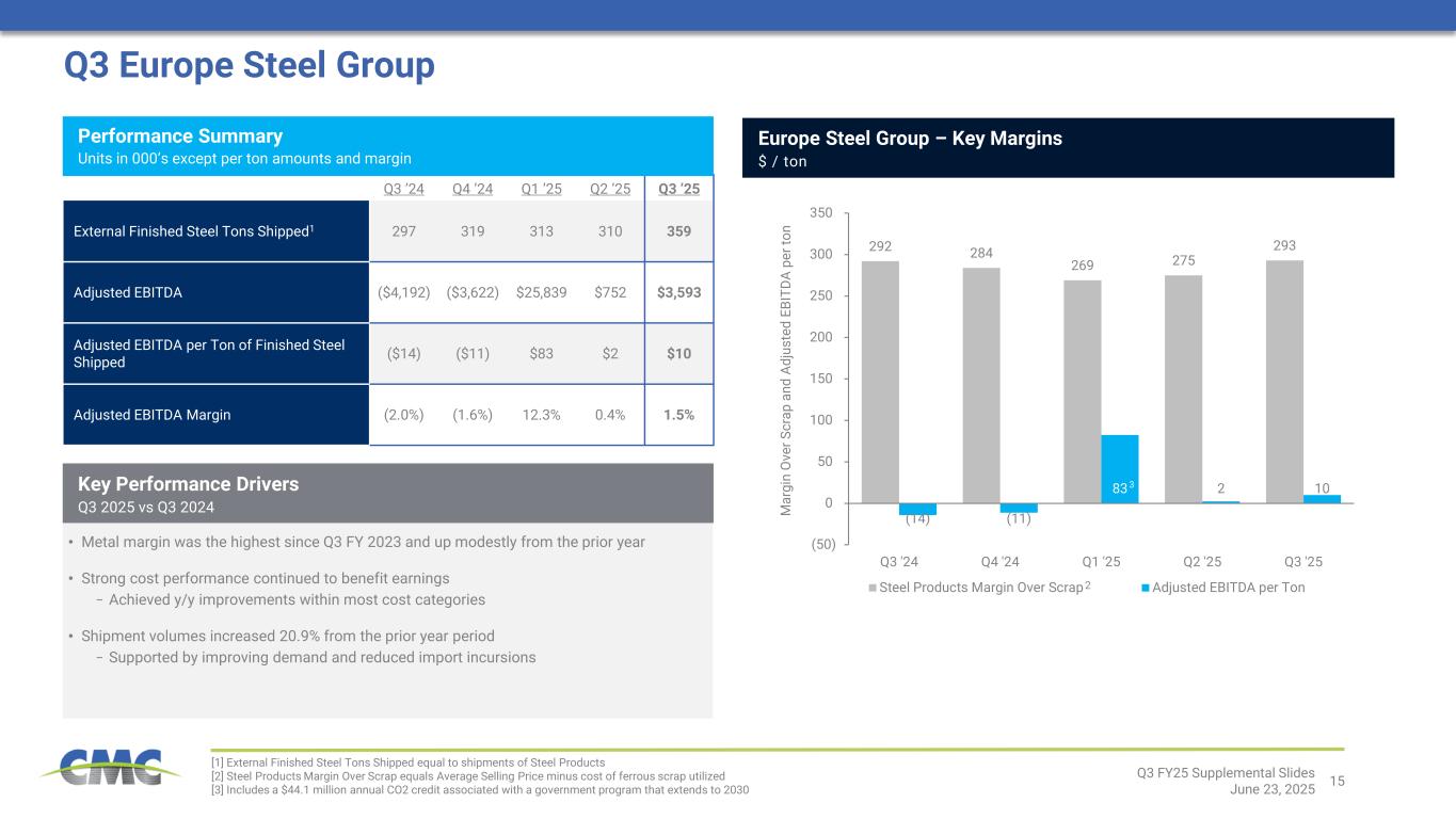 14 189 197 (0.3%) 2.8% 0.3% 0.4% 1.5% 100 120 140 160 180 200 220 Q3 2024 Geogrids & Geopiers Construction Services Impact Metals Performance Reinforcing Steel Anchoring Systems Q3 2025 Key Performance Drivers Q3 2025 vs Q3 2024 Q3 Emerging Businesses Group Q3 ’24 Q4 ’24 Q1 ’25 Q2 ’25 Q3 ’25 Net sales to external customers $188,593 $195,571 $169,415 $158,864 $197,454 Adjusted EBITDA $38,220 $42,519 $22,660 $23,519 $40,912 Adjusted EBITDA Margin 20.3% 21.7% 13.4% 14.8% 20.7% Performance Summary Units in 000’s except margin • Strong financial results within Performance Reinforcing Steel on robust project shipments and higher margin sales mix • Profitability of Tensar division declined modestly due to delays in certain projects • Healthy activity levels and stable adjusted EBITDA within CMC Construction Services division • Impact Metals results were largely unchanged from a year ago, a sign of emerging stability following several quarters of y/y declines. Key truck and trailer market appears to be past the trough Contribution to Net Sales Change – Q3 2024 to Q3 2025 Quarterly net sales figures in $ million, contribution to net sales changes provided in percentages Q3 FY25 Supplemental Slides June 23, 2025 Net sales up 4.7% Directional Change in Underlying Margin Performance