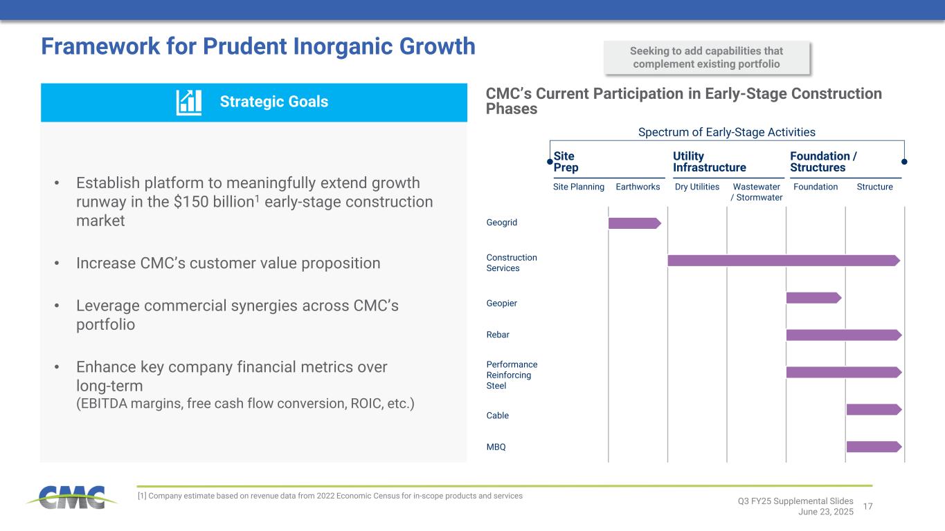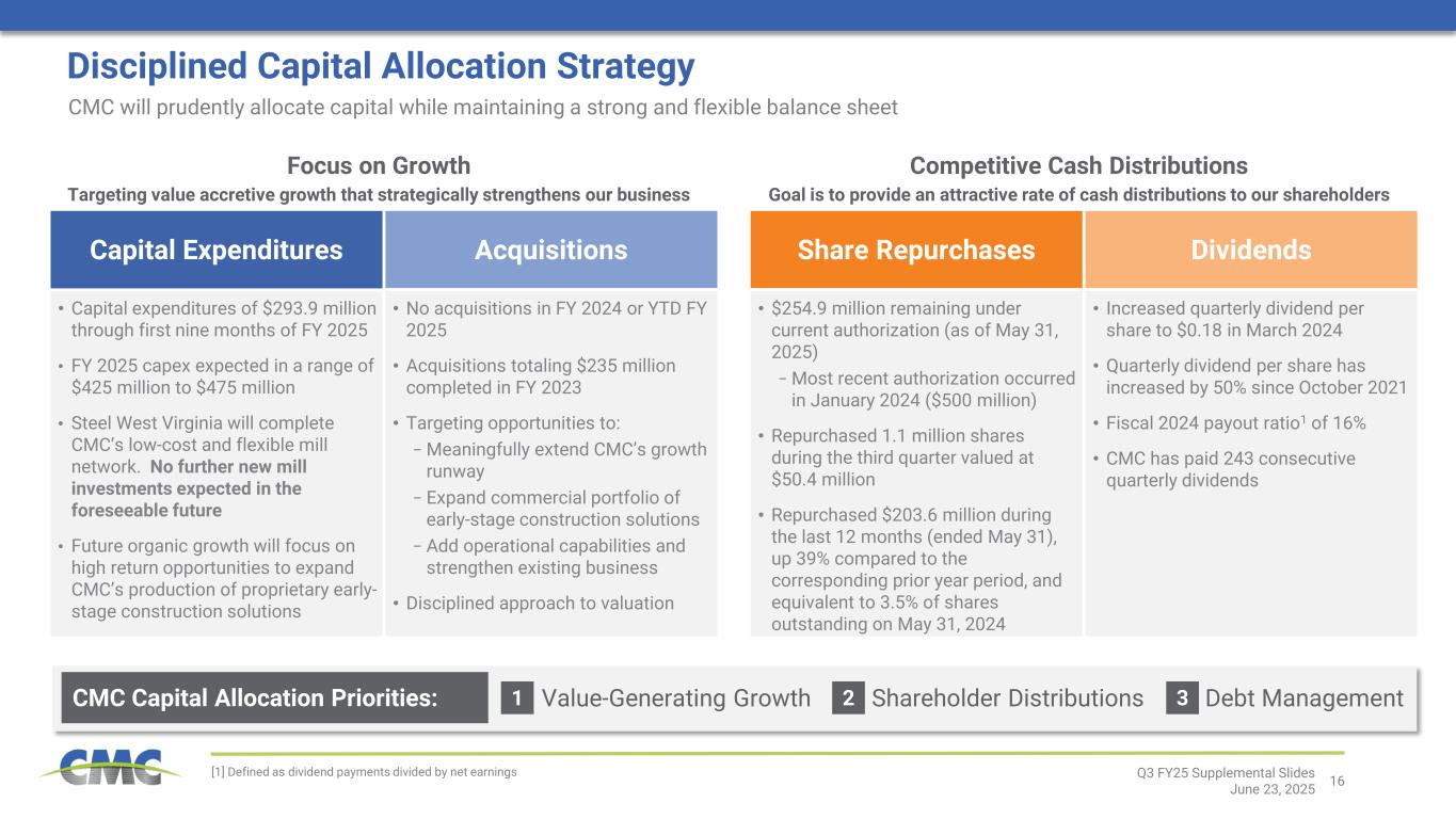 16 • Capital expenditures of $293.9 million through first nine months of FY 2025 • FY 2025 capex expected in a range of $425 million to $475 million • Steel West Virginia will complete CMC’s low-cost and flexible mill network. No further new mill investments expected in the foreseeable future • Future organic growth will focus on high return opportunities to expand CMC’s production of proprietary early- stage construction solutions Disciplined Capital Allocation Strategy CMC will prudently allocate capital while maintaining a strong and flexible balance sheet Q3 FY25 Supplemental Slides June 23, 2025 [1] Defined as dividend payments divided by net earnings 2 31 Value-Generating Growth Shareholder Distributions Debt ManagementCMC Capital Allocation Priorities: Capital Expenditures Acquisitions Share Repurchases Dividends • No acquisitions in FY 2024 or YTD FY 2025 • Acquisitions totaling $235 million completed in FY 2023 • Targeting opportunities to: − Meaningfully extend CMC’s growth runway − Expand commercial portfolio of early-stage construction solutions − Add operational capabilities and strengthen existing business • Disciplined approach to valuation • $254.9 million remaining under current authorization (as of May 31, 2025) − Most recent authorization occurred in January 2024 ($500 million) • Repurchased 1.1 million shares during the third quarter valued at $50.4 million • Repurchased $203.6 million during the last 12 months (ended May 31), up 39% compared to the corresponding prior year period, and equivalent to 3.5% of shares outstanding on May 31, 2024 • Increased quarterly dividend per share to $0.18 in March 2024 • Quarterly dividend per share has increased by 50% since October 2021 • Fiscal 2024 payout ratio1 of 16% • CMC has paid 243 consecutive quarterly dividends Focus on Growth Targeting value accretive growth that strategically strengthens our business Competitive Cash Distributions Goal is to provide an attractive rate of cash distributions to our shareholders