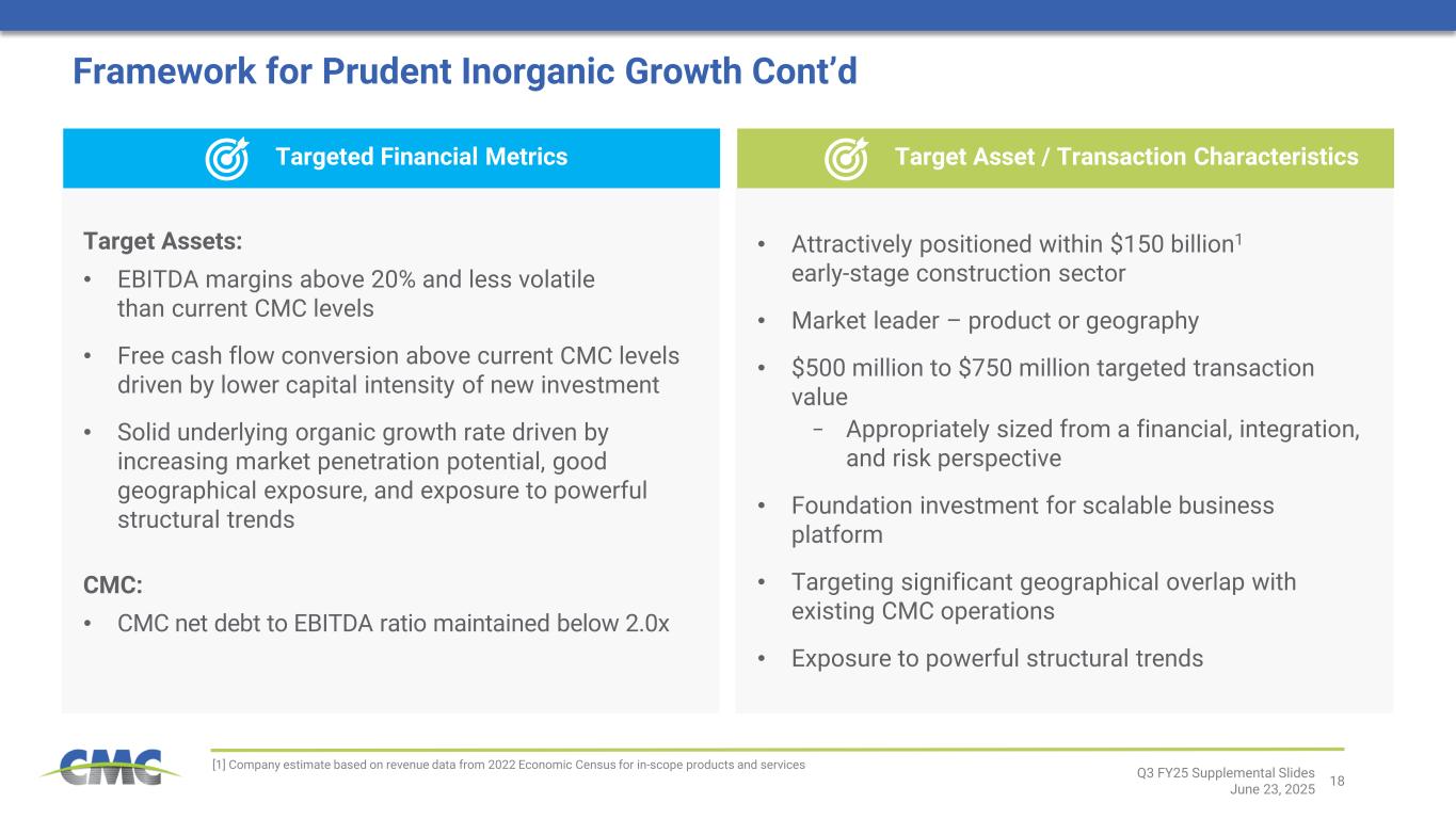 17 Framework for Prudent Inorganic Growth • Establish platform to meaningfully extend growth runway in the $150 billion1 early-stage construction market • Increase CMC’s customer value proposition • Leverage commercial synergies across CMC’s portfolio • Enhance key company financial metrics over long-term (EBITDA margins, free cash flow conversion, ROIC, etc.) Strategic Goals Site Planning Earthworks Dry Utilities Wastewater / Stormwater Foundation Structure Geogrid Construction Services Geopier Rebar Performance Reinforcing Steel Cable MBQ CMC’s Current Participation in Early-Stage Construction Phases Seeking to add capabilities that complement existing portfolio Site Prep Utility Infrastructure Foundation / Structures Q3 FY25 Supplemental Slides June 23, 2025 Spectrum of Early-Stage Activities [1] Company estimate based on revenue data from 2022 Economic Census for in-scope products and services