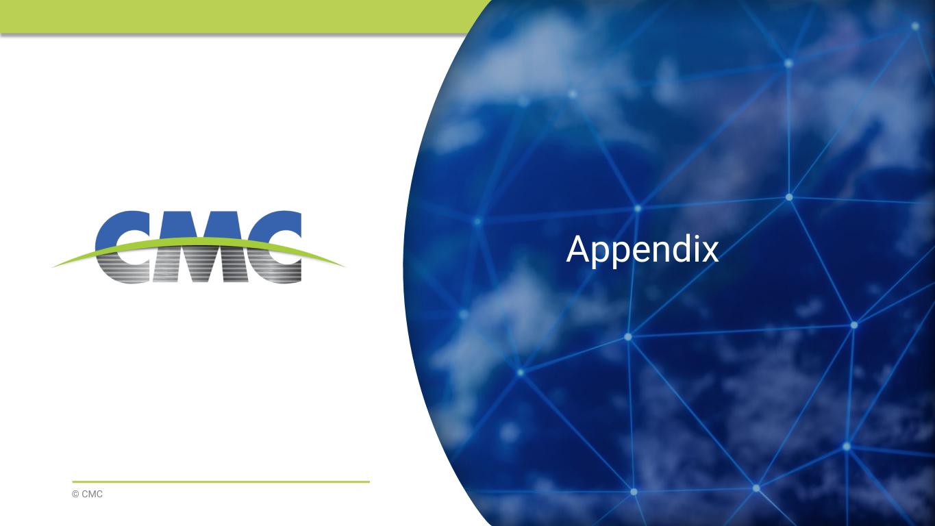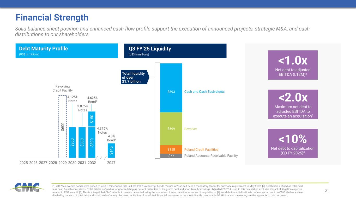 21 $77 $158 $599 $893 $3 00 $3 00 $3 00 $1 45 $6 00 $1 50 2025 2026 2027 2028 2029 2030 2031 2032 2047 Financial Strength [1] 2047 tax-exempt bonds were priced to yield 3.5%; coupon rate is 4.0%; 2032 tax-exempt bonds mature in 2055, but have a mandatory tender for purchase requirement in May 2032 [2] Net Debt is defined as total debt less cash & cash equivalents. Total debt is defined as long-term debt plus current maturities of long-term debt and short-term borrowings. Adjusted EBITDA used in this calculation excludes impact of litigation expense related to PSG lawsuit. [3] This is a target that CMC intends to remain below following the execution of an acquisition, or series of acquisitions [4] Net debt-to-capitalization is defined as net debt on CMC's balance sheet divided by the sum of total debt and stockholders' equity. For a reconciliation of non-GAAP financial measures to the most directly comparable GAAP financial measures, see the appendix to this document. Revolver Poland Credit Facilities (US$ in millions) Revolving Credit Facility 4.125% Notes Cash and Cash Equivalents 3.875% Notes Solid balance sheet position and enhanced cash flow profile support the execution of announced projects, strategic M&A, and cash distributions to our shareholders Debt Maturity Profile Q3 FY’25 Liquidity (US$ in millions) 4.375% Notes 4.0% Bond1 Poland Accounts Receivable Facility <1.0x Net debt to adjusted EBITDA (L12M)2 <2.0x Maximum net debt to adjusted EBITDA to execute an acquisition3 <10% Net debt to capitalization (Q3 FY 2025)4 Total liquidity of over $1.7 billion 4.625% Bond1
