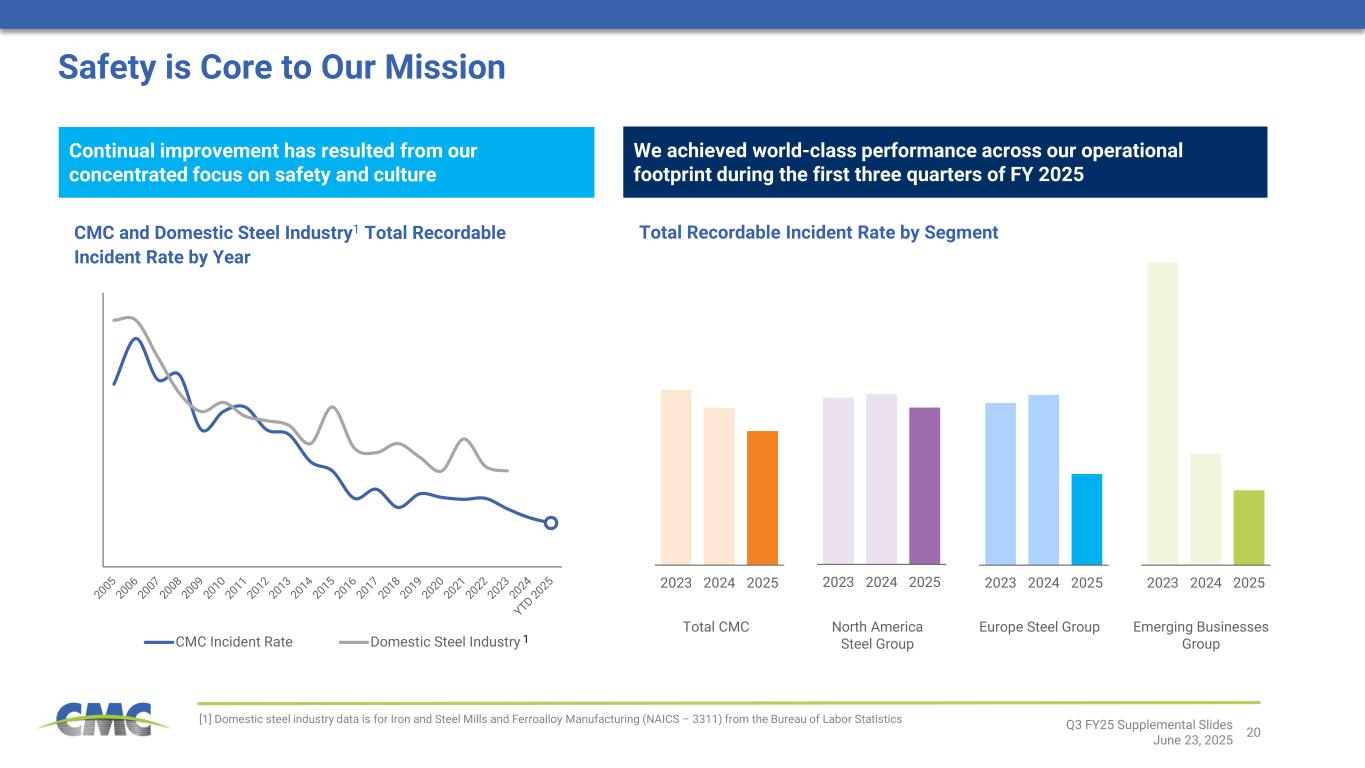 20 2023 2024 20252023 2024 20252023 2024 20252023 2024 2025 CMC Incident Rate Domestic Steel Industry 1 Safety is Core to Our Mission [1] Domestic steel industry data is for Iron and Steel Mills and Ferroalloy Manufacturing (NAICS – 3311) from the Bureau of Labor Statistics CMC and Domestic Steel Industry1 Total Recordable Incident Rate by Year Total CMC North America Steel Group Europe Steel Group Emerging Businesses Group Total Recordable Incident Rate by Segment Q3 FY25 Supplemental Slides June 23, 2025 Continual improvement has resulted from our concentrated focus on safety and culture We achieved world-class performance across our operational footprint during the first three quarters of FY 2025