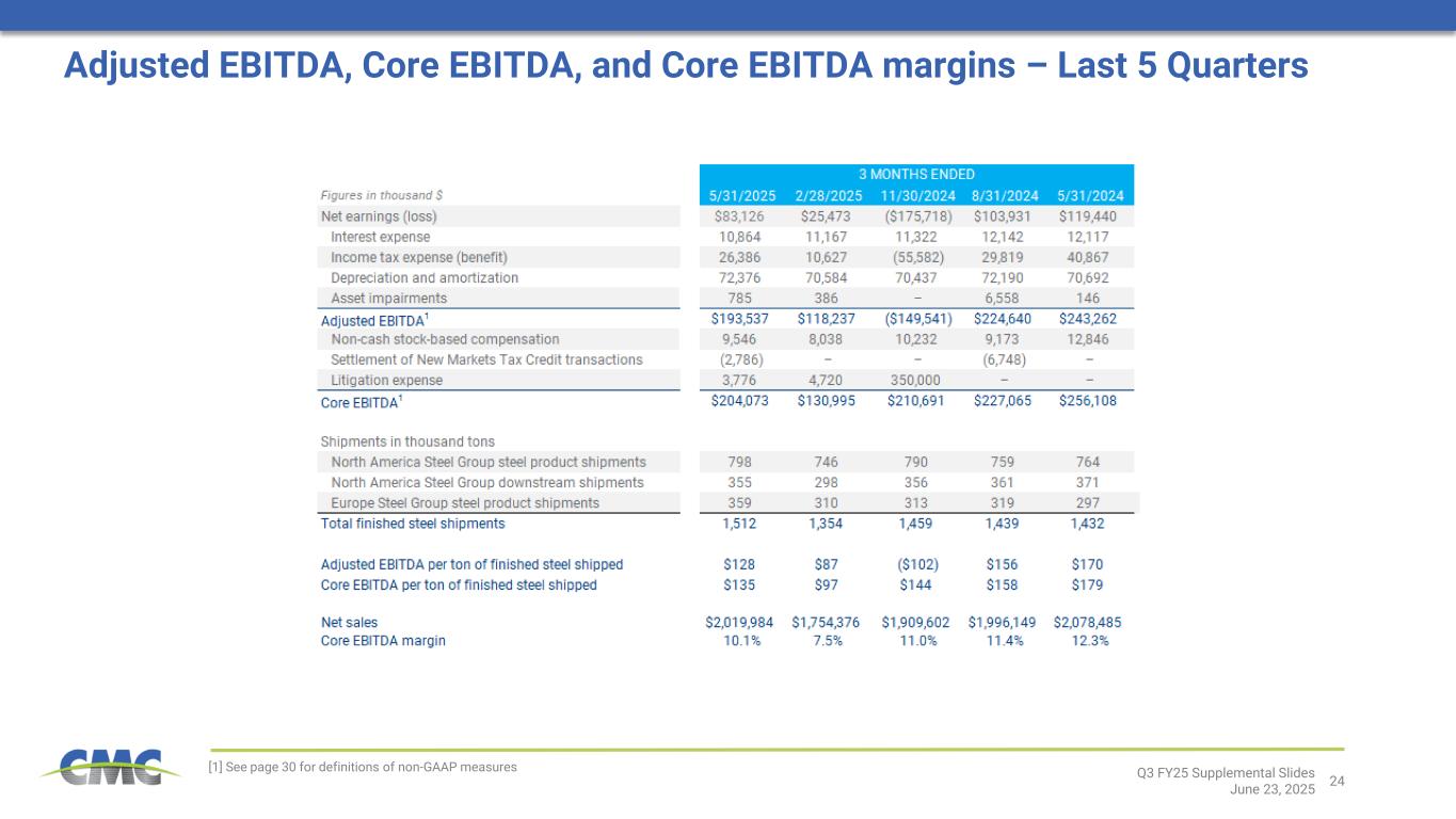 24 [1] See page 30 for definitions of non-GAAP measures Q3 FY25 Supplemental Slides June 23, 2025 Adjusted EBITDA, Core EBITDA, and Core EBITDA margins – Last 5 Quarters