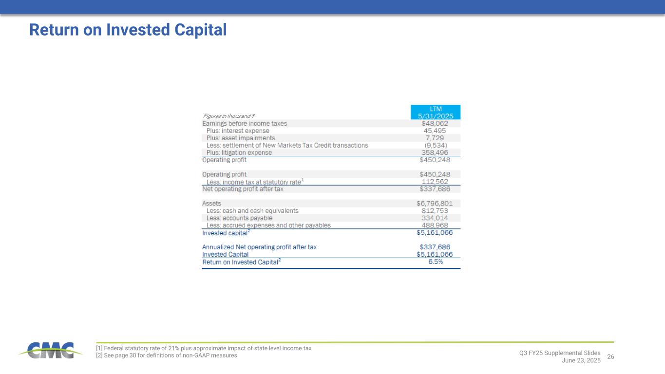 26 [1] Federal statutory rate of 21% plus approximate impact of state level income tax [2] See page 30 for definitions of non-GAAP measures Q3 FY25 Supplemental Slides June 23, 2025 Return on Invested Capital
