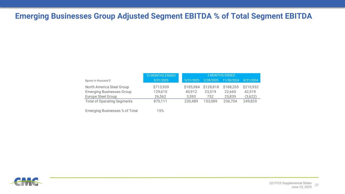 27Q3 FY25 Supplemental Slides June 23, 2025 Emerging Businesses Group Adjusted Segment EBITDA % of Total Segment EBITDA 12 MONTHS ENDED figures in thousand $ 5/31/2025 5/31/2025 2/28/2025 11/30/2024 8/31/2024 North America Steel Group $713,939 $185,984 $128,818 $188,205 $210,932 Emerging Businesses Group 129,610 40,912 23,519 22,660 42,519 Europe Steel Group 26,562 3,593 752 25,839 (3,622) Total of Operating Segments 870,111 230,489 153,089 236,704 249,829 Emerging Businesses % of Total 15% 3 MONTHS ENDED