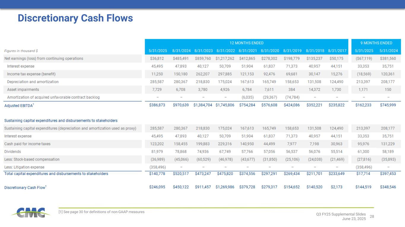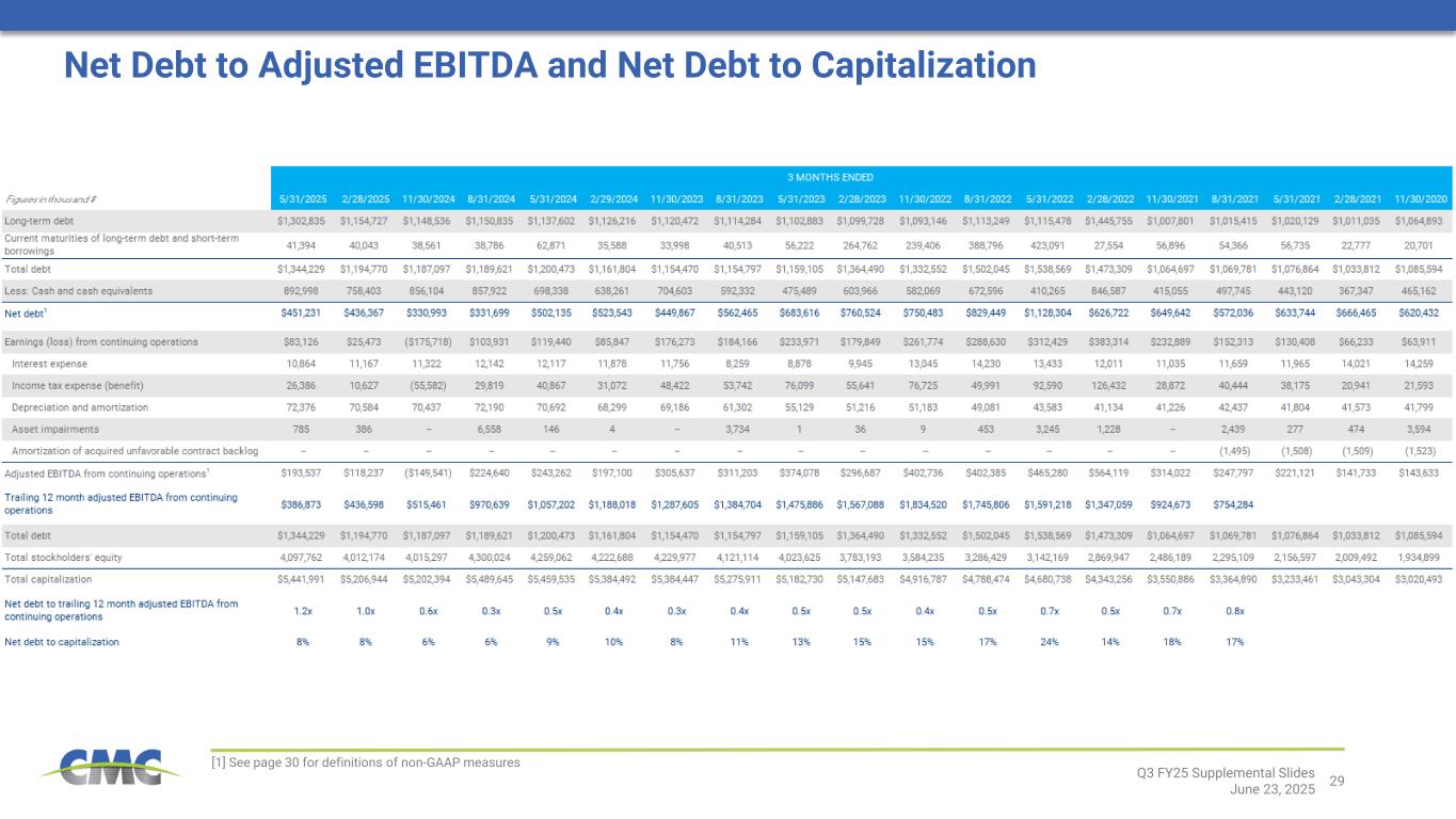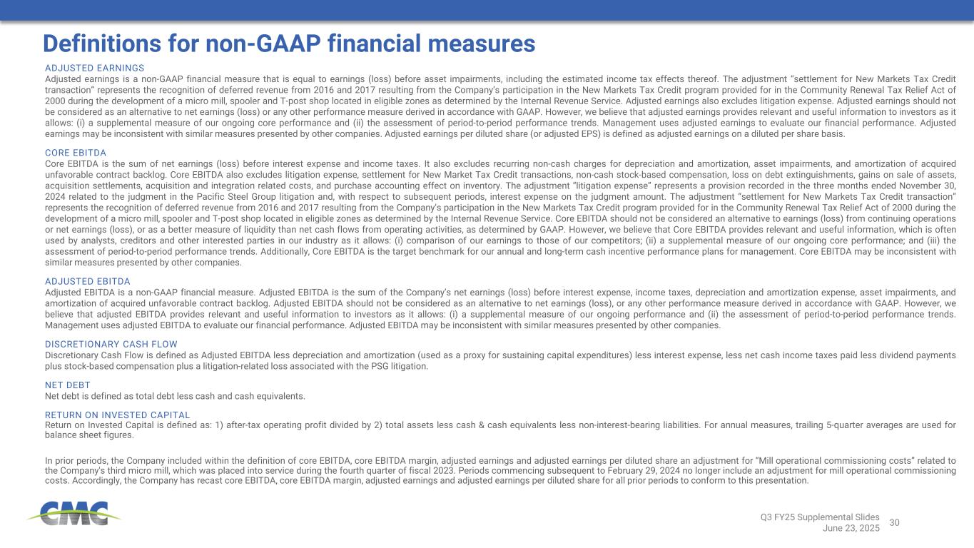 30 ADJUSTED EARNINGS Adjusted earnings is a non-GAAP financial measure that is equal to earnings (loss) before asset impairments, including the estimated income tax effects thereof. The adjustment “settlement for New Markets Tax Credit transaction” represents the recognition of deferred revenue from 2016 and 2017 resulting from the Company’s participation in the New Markets Tax Credit program provided for in the Community Renewal Tax Relief Act of 2000 during the development of a micro mill, spooler and T-post shop located in eligible zones as determined by the Internal Revenue Service. Adjusted earnings also excludes litigation expense. Adjusted earnings should not be considered as an alternative to net earnings (loss) or any other performance measure derived in accordance with GAAP. However, we believe that adjusted earnings provides relevant and useful information to investors as it allows: (i) a supplemental measure of our ongoing core performance and (ii) the assessment of period-to-period performance trends. Management uses adjusted earnings to evaluate our financial performance. Adjusted earnings may be inconsistent with similar measures presented by other companies. Adjusted earnings per diluted share (or adjusted EPS) is defined as adjusted earnings on a diluted per share basis. CORE EBITDA Core EBITDA is the sum of net earnings (loss) before interest expense and income taxes. It also excludes recurring non-cash charges for depreciation and amortization, asset impairments, and amortization of acquired unfavorable contract backlog. Core EBITDA also excludes litigation expense, settlement for New Market Tax Credit transactions, non-cash stock-based compensation, loss on debt extinguishments, gains on sale of assets, acquisition settlements, acquisition and integration related costs, and purchase accounting effect on inventory. The adjustment “litigation expense” represents a provision recorded in the three months ended November 30, 2024 related to the judgment in the Pacific Steel Group litigation and, with respect to subsequent periods, interest expense on the judgment amount. The adjustment “settlement for New Markets Tax Credit transaction” represents the recognition of deferred revenue from 2016 and 2017 resulting from the Company’s participation in the New Markets Tax Credit program provided for in the Community Renewal Tax Relief Act of 2000 during the development of a micro mill, spooler and T-post shop located in eligible zones as determined by the Internal Revenue Service. Core EBITDA should not be considered an alternative to earnings (loss) from continuing operations or net earnings (loss), or as a better measure of liquidity than net cash flows from operating activities, as determined by GAAP. However, we believe that Core EBITDA provides relevant and useful information, which is often used by analysts, creditors and other interested parties in our industry as it allows: (i) comparison of our earnings to those of our competitors; (ii) a supplemental measure of our ongoing core performance; and (iii) the assessment of period-to-period performance trends. Additionally, Core EBITDA is the target benchmark for our annual and long-term cash incentive performance plans for management. Core EBITDA may be inconsistent with similar measures presented by other companies. ADJUSTED EBITDA Adjusted EBITDA is a non-GAAP financial measure. Adjusted EBITDA is the sum of the Company’s net earnings (loss) before interest expense, income taxes, depreciation and amortization expense, asset impairments, and amortization of acquired unfavorable contract backlog. Adjusted EBITDA should not be considered as an alternative to net earnings (loss), or any other performance measure derived in accordance with GAAP. However, we believe that adjusted EBITDA provides relevant and useful information to investors as it allows: (i) a supplemental measure of our ongoing performance and (ii) the assessment of period-to-period performance trends. Management uses adjusted EBITDA to evaluate our financial performance. Adjusted EBITDA may be inconsistent with similar measures presented by other companies. DISCRETIONARY CASH FLOW Discretionary Cash Flow is defined as Adjusted EBITDA less depreciation and amortization (used as a proxy for sustaining capital expenditures) less interest expense, less net cash income taxes paid less dividend payments plus stock-based compensation plus a litigation-related loss associated with the PSG litigation. NET DEBT Net debt is defined as total debt less cash and cash equivalents. RETURN ON INVESTED CAPITAL Return on Invested Capital is defined as: 1) after-tax operating profit divided by 2) total assets less cash & cash equivalents less non-interest-bearing liabilities. For annual measures, trailing 5-quarter averages are used for balance sheet figures. In prior periods, the Company included within the definition of core EBITDA, core EBITDA margin, adjusted earnings and adjusted earnings per diluted share an adjustment for “Mill operational commissioning costs” related to the Company's third micro mill, which was placed into service during the fourth quarter of fiscal 2023. Periods commencing subsequent to February 29, 2024 no longer include an adjustment for mill operational commissioning costs. Accordingly, the Company has recast core EBITDA, core EBITDA margin, adjusted earnings and adjusted earnings per diluted share for all prior periods to conform to this presentation. Q3 FY25 Supplemental Slides June 23, 2025 Definitions for non-GAAP financial measures