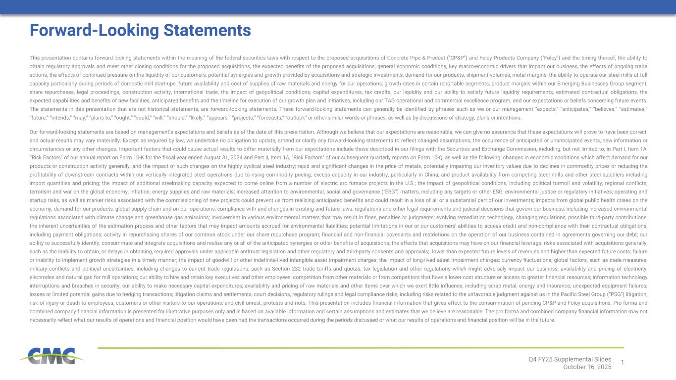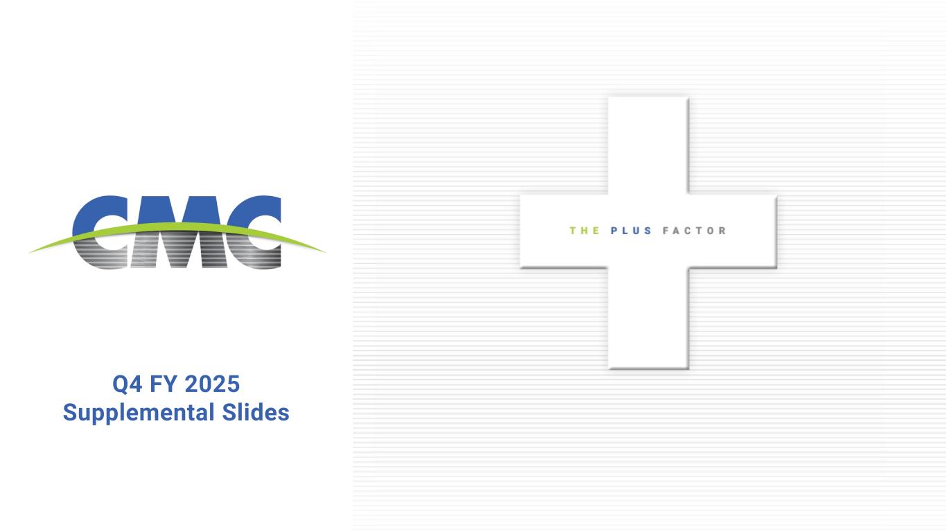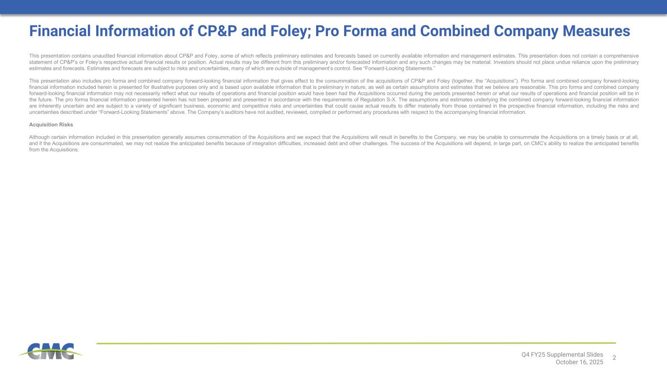2Q4 FY25 Supplemental Slides October 16, 2025 Financial Information of CP&P and Foley; Pro Forma and Combined Company Measures This presentation contains unaudited financial information about CP&P and Foley, some of which reflects preliminary estimates and forecasts based on currently available information and management estimates. This presentation does not contain a comprehensive statement of CP&P’s or Foley’s respective actual financial results or position. Actual results may be different from this preliminary and/or forecasted information and any such changes may be material. Investors should not place undue reliance upon the preliminary estimates and forecasts. Estimates and forecasts are subject to risks and uncertainties, many of which are outside of management’s control. See “Forward-Looking Statements.” This presentation also includes pro forma and combined company forward-looking financial information that gives effect to the consummation of the acquisitions of CP&P and Foley (together, the “Acquisitions”). Pro forma and combined company forward-looking financial information included herein is presented for illustrative purposes only and is based upon available information that is preliminary in nature, as well as certain assumptions and estimates that we believe are reasonable. This pro forma and combined company forward-looking financial information may not necessarily reflect what our results of operations and financial position would have been had the Acquisitions occurred during the periods presented herein or what our results of operations and financial position will be in the future. The pro forma financial information presented herein has not been prepared and presented in accordance with the requirements of Regulation S-X. The assumptions and estimates underlying the combined company forward-looking financial information are inherently uncertain and are subject to a variety of significant business, economic and competitive risks and uncertainties that could cause actual results to differ materially from those contained in the prospective financial information, including the risks and uncertainties described under “Forward-Looking Statements” above. The Company’s auditors have not audited, reviewed, compiled or performed any procedures with respect to the accompanying financial information. Acquisition Risks Although certain information included in this presentation generally assumes consummation of the Acquisitions and we expect that the Acquisitions will result in benefits to the Company, we may be unable to consummate the Acquisitions on a timely basis or at all, and if the Acquisitions are consummated, we may not realize the anticipated benefits because of integration difficulties, increased debt and other challenges. The success of the Acquisitions will depend, in large part, on CMC’s ability to realize the anticipated benefits from the Acquisitions.