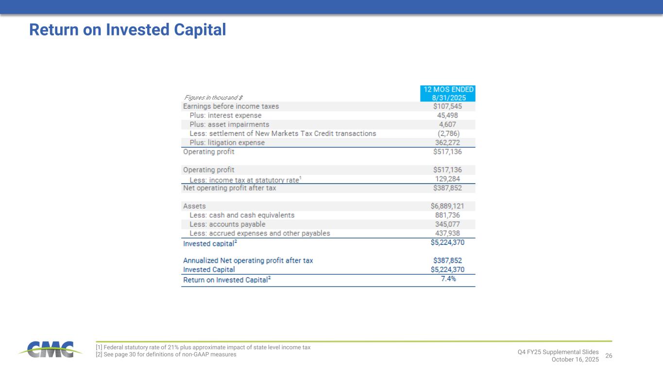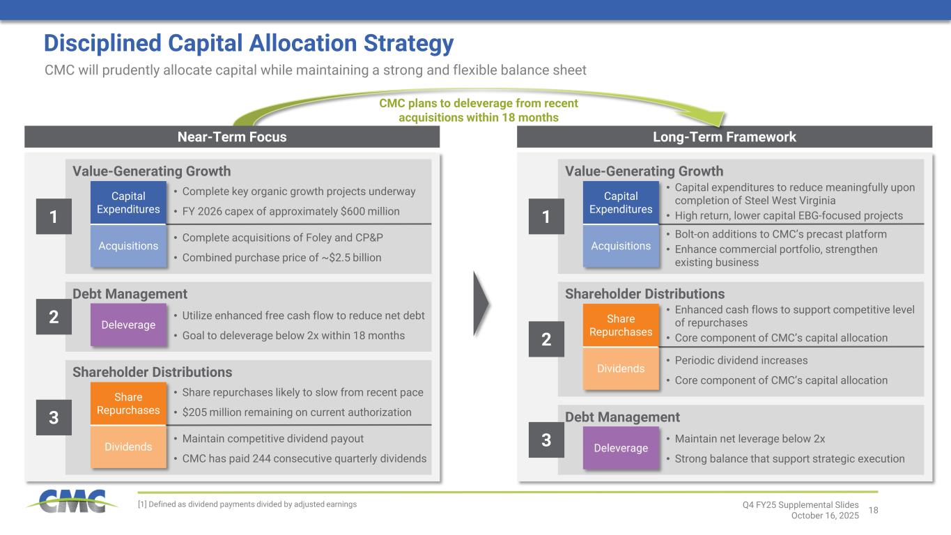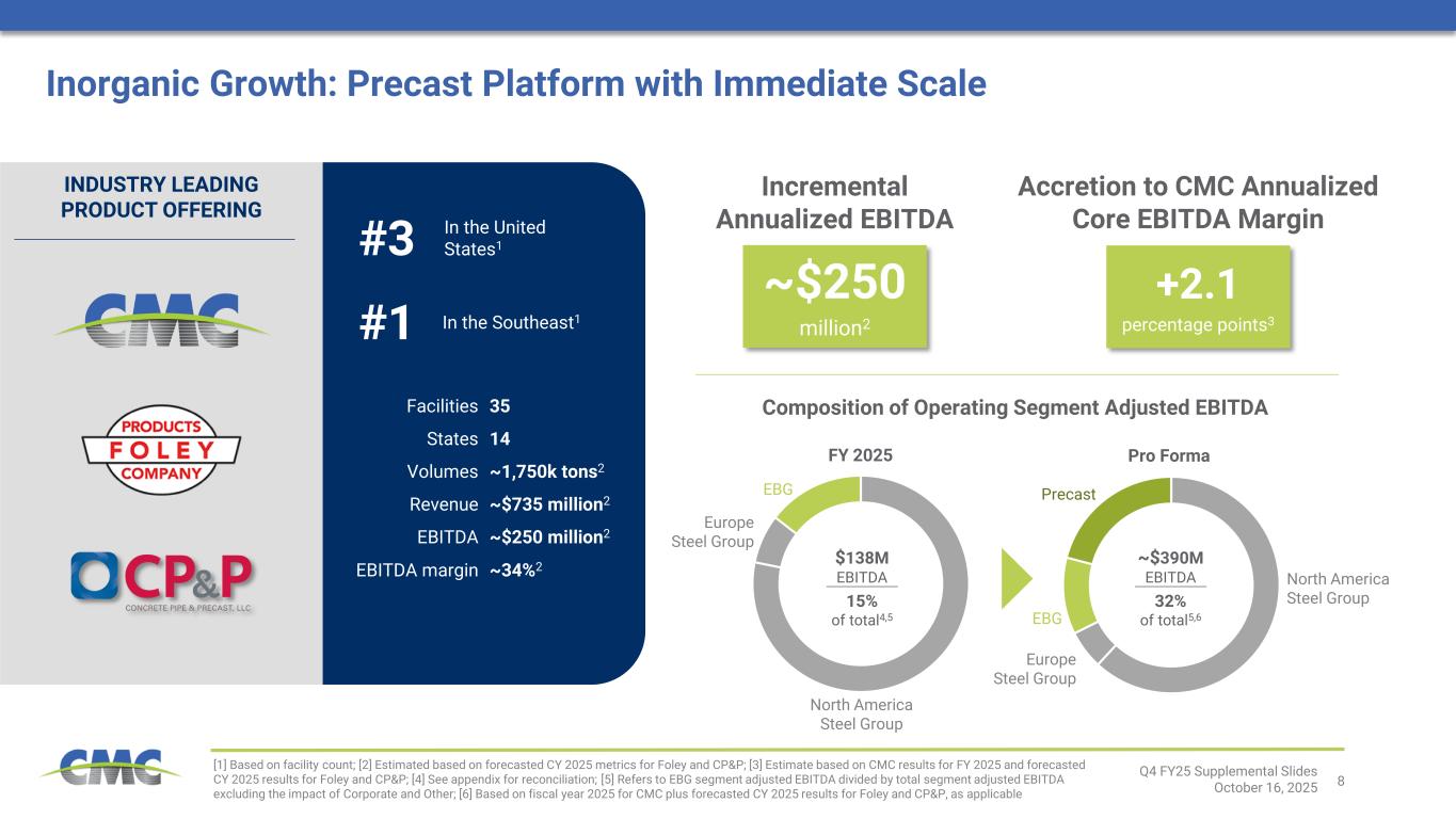 2Q4 FY25 Supplemental Slides October 16, 2025 Financial Information of CP&P and Foley; Pro Forma and Combined Company Measures This presentation contains unaudited financial information about CP&P and Foley, some of which reflects preliminary estimates and forecasts based on currently available information and management estimates. This presentation does not contain a comprehensive statement of CP&P’s or Foley’s respective actual financial results or position. Actual results may be different from this preliminary and/or forecasted information and any such changes may be material. Investors should not place undue reliance upon the preliminary estimates and forecasts. Estimates and forecasts are subject to risks and uncertainties, many of which are outside of management’s control. See “Forward-Looking Statements.” This presentation also includes pro forma and combined company forward-looking financial information that gives effect to the consummation of the acquisitions of CP&P and Foley (together, the “Acquisitions”). Pro forma and combined company forward-looking financial information included herein is presented for illustrative purposes only and is based upon available information that is preliminary in nature, as well as certain assumptions and estimates that we believe are reasonable. This pro forma and combined company forward-looking financial information may not necessarily reflect what our results of operations and financial position would have been had the Acquisitions occurred during the periods presented herein or what our results of operations and financial position will be in the future. The pro forma financial information presented herein has not been prepared and presented in accordance with the requirements of Regulation S-X. The assumptions and estimates underlying the combined company forward-looking financial information are inherently uncertain and are subject to a variety of significant business, economic and competitive risks and uncertainties that could cause actual results to differ materially from those contained in the prospective financial information, including the risks and uncertainties described under “Forward-Looking Statements” above. The Company’s auditors have not audited, reviewed, compiled or performed any procedures with respect to the accompanying financial information. Acquisition Risks Although certain information included in this presentation generally assumes consummation of the Acquisitions and we expect that the Acquisitions will result in benefits to the Company, we may be unable to consummate the Acquisitions on a timely basis or at all, and if the Acquisitions are consummated, we may not realize the anticipated benefits because of integration difficulties, increased debt and other challenges. The success of the Acquisitions will depend, in large part, on CMC’s ability to realize the anticipated benefits from the Acquisitions.