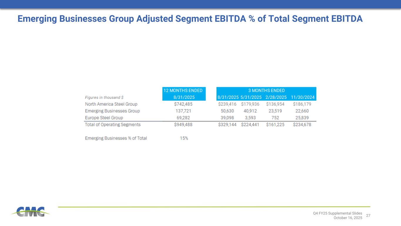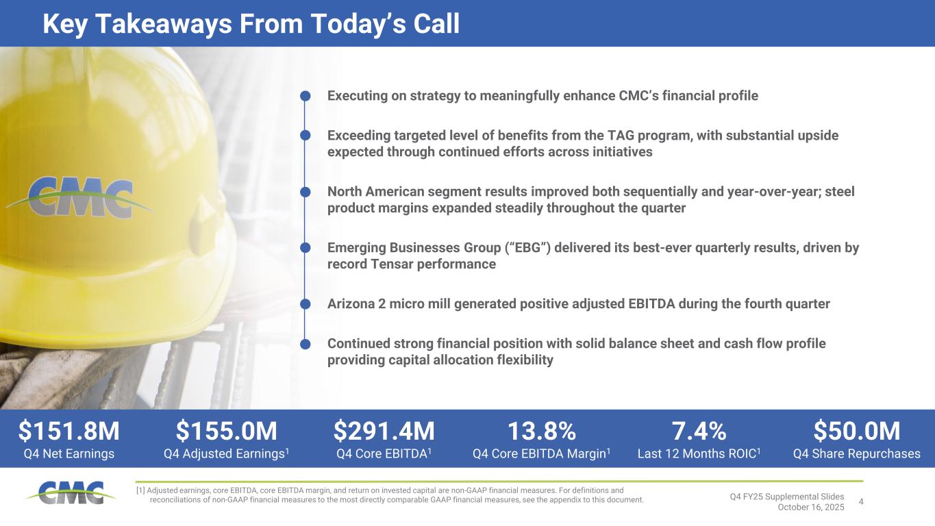 4Q4 FY25 Supplemental Slides October 16, 2025 [1] Adjusted earnings, core EBITDA, core EBITDA margin, and return on invested capital are non-GAAP financial measures. For definitions and reconciliations of non-GAAP financial measures to the most directly comparable GAAP financial measures, see the appendix to this document. Executing on strategy to meaningfully enhance CMC’s financial profile Exceeding targeted level of benefits from the TAG program, with substantial upside expected through continued efforts across initiatives North American segment results improved both sequentially and year-over-year; steel product margins expanded steadily throughout the quarter Emerging Businesses Group (“EBG”) delivered its best-ever quarterly results, driven by record Tensar performance Arizona 2 micro mill generated positive adjusted EBITDA during the fourth quarter Continued strong financial position with solid balance sheet and cash flow profile providing capital allocation flexibility $151.8M Q4 Net Earnings $155.0M Q4 Adjusted Earnings1 $291.4M Q4 Core EBITDA1 13.8% Q4 Core EBITDA Margin1 7.4% Last 12 Months ROIC1 $50.0M Q4 Share Repurchases Key Takeaways From Today’s Call