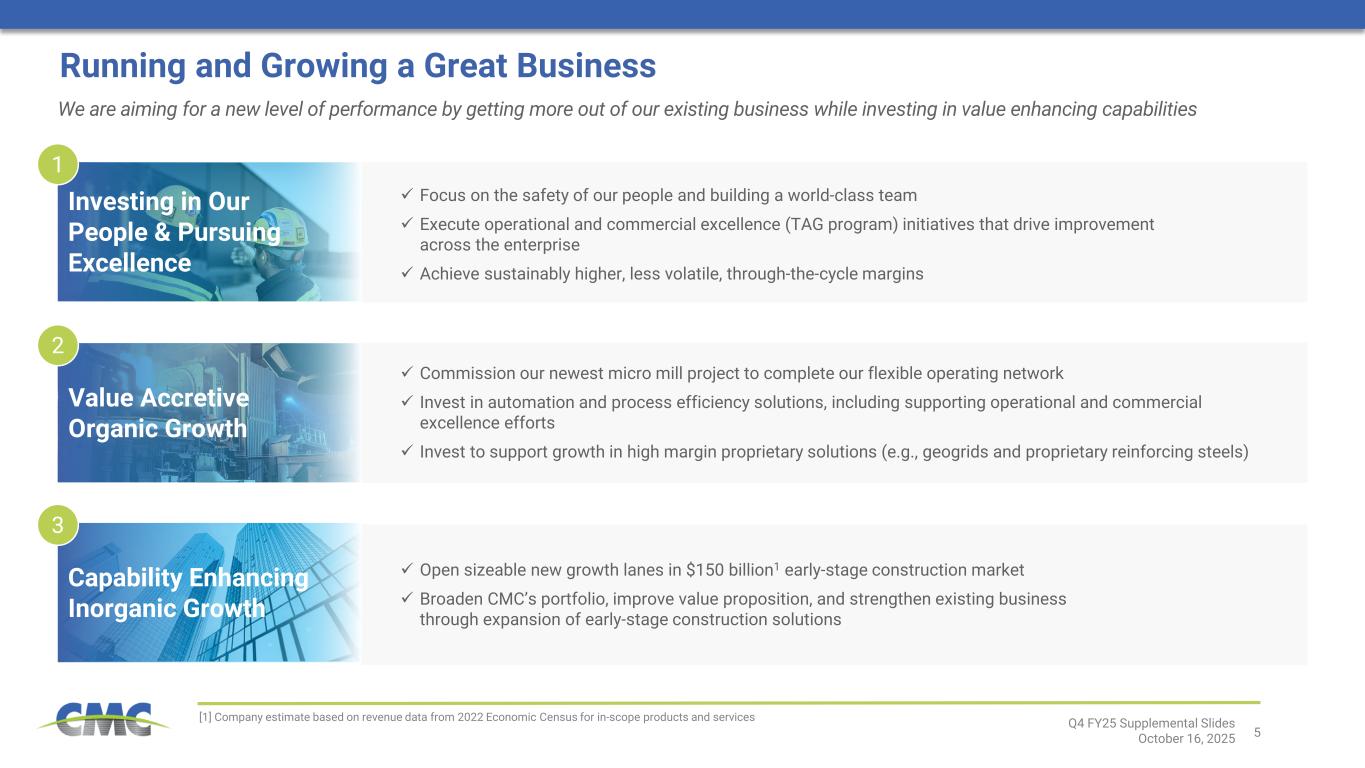 3 © GeoNames, Microsoft, TomTom Powered by Bing A Market Leader with a Winning Formula CMC is charting the course for improved profitability. Starting from a position of competitive strength, we see structural tailwinds in our core North American construction markets for years to come and meaningful opportunities for margin growth. Strong Competitive Position Solid Momentum Supported by Exposure to Attractive End Markets Game Changing Strategy to Create Value  Leading domestic market positions in major solutions1  Density in high-growth Sunbelt region  Excellent balance sheet and financial flexibility #1 • Rebar • Fabricated Rebar • Geogrid • Anchor cages • Fence posts • Aggregate Piers Re ba r D em an d pe r C ap ita 4  Powerful, long-term structural demand trends  Strong public infrastructure spending; 60%2 of the Infrastructure Investment and Jobs Act (“IIJA”) remaining to be spent  Robust pipeline of construction projects with pent-up demand building  Margins expanding  $150 billion3 early-stage construction market to accommodate future growth aspirations • Infrastructure investment • Re-shoring of manufacturing • Energy generation and transmission • Addressing U.S. housing shortage • AI infrastructure • Positive demographics in Sunbelt  Focus on value generation for shareholders regardless of market environment  Targeting permanent enhancements to financial profile, including:  Higher, more stable margins and earnings  Cash flows with reduced capital intensity  Higher ROICs Q4 FY25 Supplemental Slides October 16, 2025  Demonstrated capability with our Transform, Advance, Grow ("TAG") program, with more to come  High return organic growth projects in pipeline  Evaluating and pursuing opportunities for inorganic growth to complement product offering and increase value add  Robust capital returns to shareholders [1] Based on company estimates [2] IIJA funding status as of July 31, 2025 per U.S. Department of Transportation [3] Company estimate based on revenue data from 2022 Economic Census for in-scope products and services [4] Based on data from the Concrete Reinforcing Steel Institute and the U.S. Census Bureau