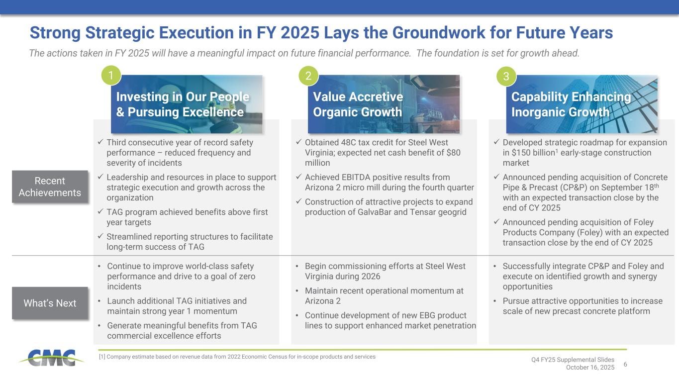 5 Running and Growing a Great Business Q4 FY25 Supplemental Slides October 16, 2025 We are aiming for a new level of performance by getting more out of our existing business while investing in value enhancing capabilities Investing in Our People & Pursuing Excellence Value Accretive Organic Growth Capability Enhancing Inorganic Growth 1 2 3  Focus on the safety of our people and building a world-class team  Execute operational and commercial excellence (TAG program) initiatives that drive improvement across the enterprise  Achieve sustainably higher, less volatile, through-the-cycle margins  Commission our newest micro mill project to complete our flexible operating network  Invest in automation and process efficiency solutions, including supporting operational and commercial excellence efforts  Invest to support growth in high margin proprietary solutions (e.g., geogrids and proprietary reinforcing steels)  Open sizeable new growth lanes in $150 billion1 early-stage construction market  Broaden CMC’s portfolio, improve value proposition, and strengthen existing business through expansion of early-stage construction solutions [1] Company estimate based on revenue data from 2022 Economic Census for in-scope products and services