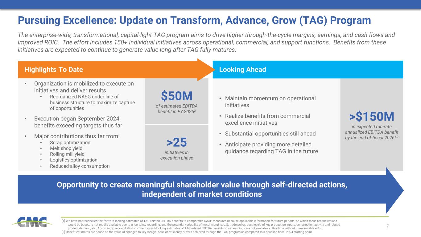 6 Strong Strategic Execution in FY 2025 Lays the Groundwork for Future Years Q4 FY25 Supplemental Slides October 16, 2025 The actions taken in FY 2025 will have a meaningful impact on future financial performance. The foundation is set for growth ahead. Investing in Our People & Pursuing Excellence 1 Value Accretive Organic Growth 2 Capability Enhancing Inorganic Growth 3 [1] Company estimate based on revenue data from 2022 Economic Census for in-scope products and services  Third consecutive year of record safety performance – reduced frequency and severity of incidents  Leadership and resources in place to support strategic execution and growth across the organization  TAG program achieved benefits above first year targets  Streamlined reporting structures to facilitate long-term success of TAG • Continue to improve world-class safety performance and drive to a goal of zero incidents • Launch additional TAG initiatives and maintain strong year 1 momentum • Generate meaningful benefits from TAG commercial excellence efforts  Obtained 48C tax credit for Steel West Virginia; expected net cash benefit of $80 million  Achieved EBITDA positive results from Arizona 2 micro mill during the fourth quarter  Construction of attractive projects to expand production of GalvaBar and Tensar geogrid • Begin commissioning efforts at Steel West Virginia during 2026 • Maintain recent operational momentum at Arizona 2 • Continue development of new EBG product lines to support enhanced market penetration  Developed strategic roadmap for expansion in $150 billion1 early-stage construction market  Announced pending acquisition of Concrete Pipe & Precast (CP&P) on September 18th with an expected transaction close by the end of CY 2025  Announced pending acquisition of Foley Products Company (Foley) with an expected transaction close by the end of CY 2025 • Successfully integrate CP&P and Foley and execute on identified growth and synergy opportunities • Pursue attractive opportunities to increase scale of new precast concrete platform Recent Achievements What’s Next