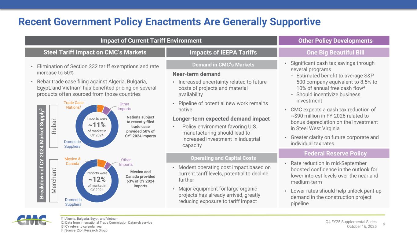 8 Inorganic Growth: Precast Platform with Immediate Scale Facilities 35 States 14 Volumes ~1,750k tons2 Revenue ~$735 million2 EBITDA ~$250 million2 EBITDA margin ~34%2 In the United States1 In the Southeast1 #3 #1 INDUSTRY LEADING PRODUCT OFFERING Incremental Annualized EBITDA ~$250 million2 Composition of Operating Segment Adjusted EBITDA Accretion to CMC Annualized Core EBITDA Margin +2.1 percentage points3 Q4 FY25 Supplemental Slides October 16, 2025 EBG EBG Precast $138M EBITDA 15% of total4,5 ~$390M EBITDA 32% of total5,6 FY 2025 Pro Forma Europe Steel Group North America Steel Group Europe Steel Group North America Steel Group [1] Based on facility count; [2] Estimated based on forecasted CY 2025 metrics for Foley and CP&P; [3] Estimate based on CMC results for FY 2025 and forecasted CY 2025 results for Foley and CP&P; [4] See appendix for reconciliation; [5] Refers to EBG segment adjusted EBITDA divided by total segment adjusted EBITDA excluding the impact of Corporate and Other; [6] Based on fiscal year 2025 for CMC plus forecasted CY 2025 results for Foley and CP&P, as applicable