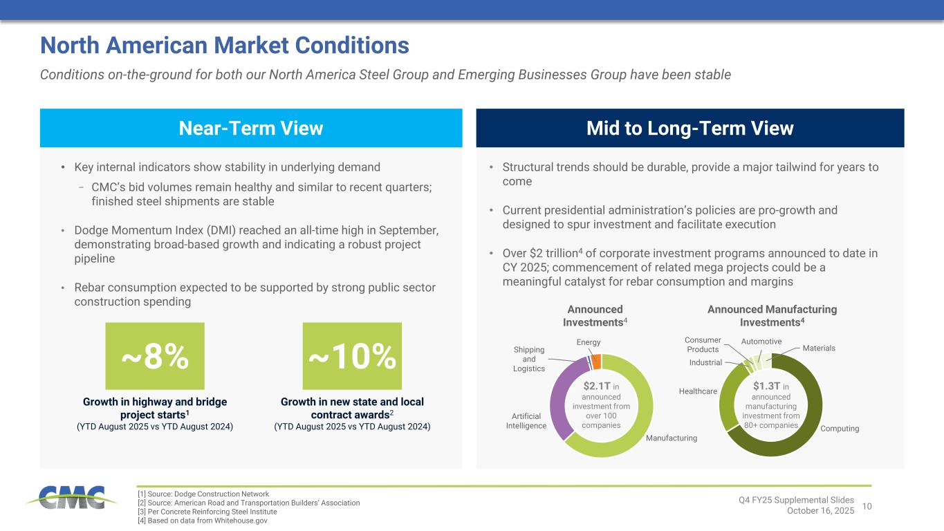 9 • Rate reduction in mid-September boosted confidence in the outlook for lower interest levels over the near and medium-term • Lower rates should help unlock pent-up demand in the construction project pipeline • Significant cash tax savings through several programs − Estimated benefit to average S&P 500 company equivalent to 8.5% to 10% of annual free cash flow4 − Should incentivize business investment • CMC expects a cash tax reduction of ~$90 million in FY 2026 related to bonus depreciation on the investment in Steel West Virginia • Greater clarity on future corporate and individual tax rates • Modest operating cost impact based on current tariff levels, potential to decline further • Major equipment for large organic projects has already arrived, greatly reducing exposure to tariff impact Near-term demand • Increased uncertainty related to future costs of projects and material availability • Pipeline of potential new work remains active Longer-term expected demand impact • Policy environment favoring U.S. manufacturing should lead to increased investment in industrial capacity Demand in CMC’s Markets• Elimination of Section 232 tariff exemptions and rate increase to 50% • Rebar trade case filing against Algeria, Bulgaria, Egypt, and Vietnam has benefited pricing on several products often sourced from those countries Mexico & Canada Other Imports Domestic Suppliers Trade Case Nations1 Other Imports Domestic Suppliers Recent Government Policy Enactments Are Generally Supportive Steel Tariff Impact on CMC’s Markets Impacts of IEEPA Tariffs Br ea kd ow n of C Y 20 24 M ar ke t S up pl y2 Re ba r M er ch an t Q4 FY25 Supplemental Slides October 16, 2025 Nations subject to recently filed trade case provided 50% of CY3 2024 imports Imports were ~11% of market in CY 2024 Imports were ~12% of market in CY 2024 Mexico and Canada provided 63% of CY 2024 imports [1] Algeria, Bulgaria, Egypt, and Vietnam [2] Data from International Trade Commission Dataweb service [3] CY refers to calendar year [4] Source: Zion Research Group Operating and Capital Costs Impact of Current Tariff Environment Other Policy Developments One Big Beautiful Bill Federal Reserve Policy