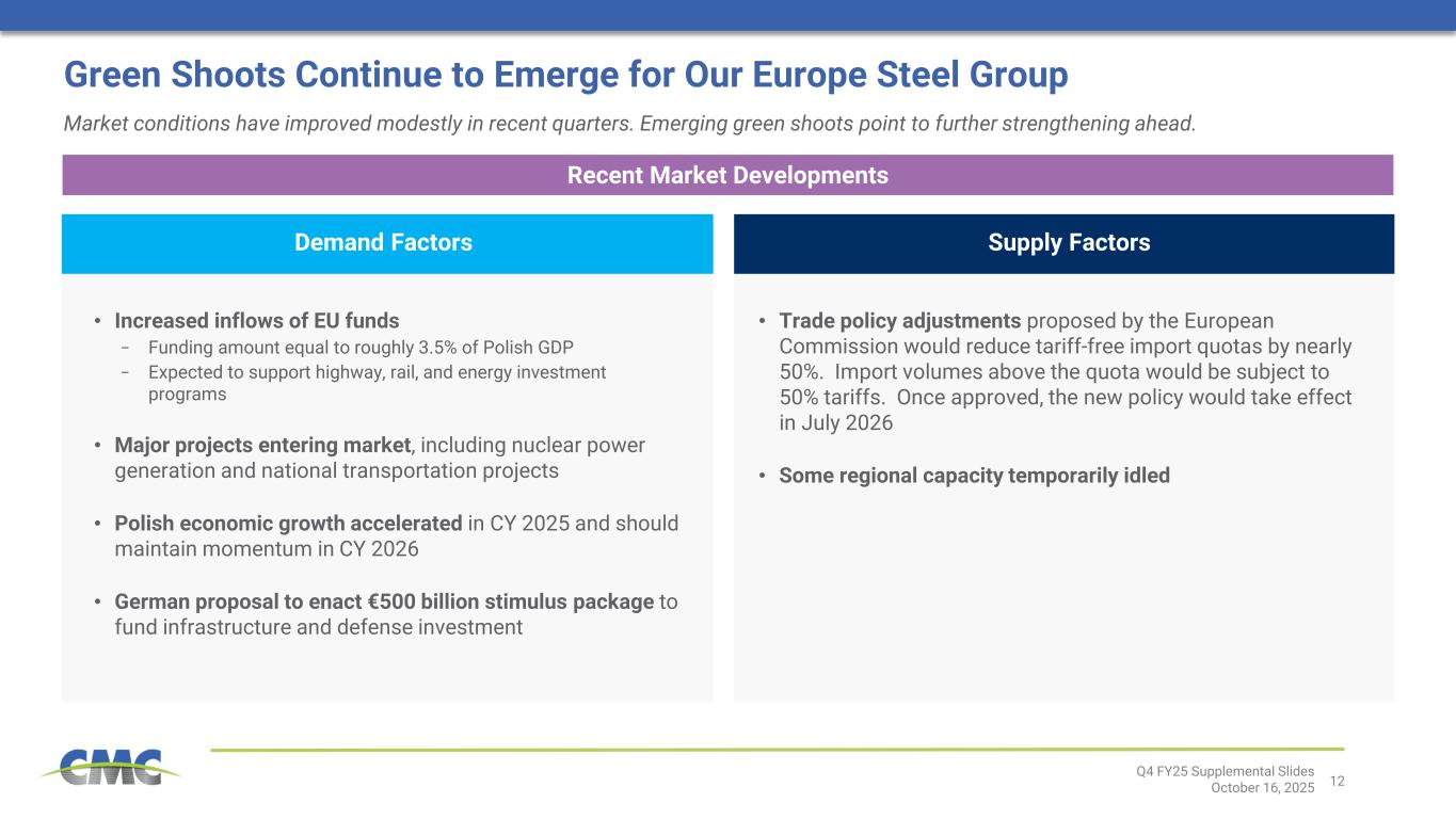11 EBG is Delivering Strong Results… Q4 FY25 Supplemental Slides October 16, 2025 $138M adjusted EBITDA 18.4% EBITDA margin 15% of segment EBITDA1 CMC Construction Services Tensar CMC Impact Metals CMC Anchoring Systems Performance Reinforcing Steel Description Soil stabilization for road, foundation, and other construction applications Proprietary reinforcing steel products used in critical applications Distribution operations servicing concrete contractors Anchoring solutions for the electrical transmission market Heat-treated performance steel products Customer Solutions Tilt-wall, formwork, safety gear, equipment rental Engineered cages, bolts, and fasteners Key Customer Groups • Civil engineers • State DOTs • General contractors • State DOTs • General contractors • Distributors • Concrete contractors and installers • Utility providers • Utility contractors • Defense OEM • Truck trailer OEM • Equipment OEM Business Drivers • Increased market penetration • Infrastructure investment • Trend toward lower labor intensity and faster construction • Coastal bridge and highway construction • Port construction and repairs • LNG investments • Construction activity in the South- Central U.S., particularly Texas • Population growth in Texas • Investments in transmission and distribution • Growth of renewable energy generation requiring connection to grid • Truck and trailer fleet expansion • Defense spending • Construction spending CMC Competitive Advantage  Innovation leader  Strong value proposition on virtually every project  Growing market penetration  Scalable platform  Leader in most major Texas metro markets  Strong customer loyalty  Scalable business platform  Proprietary solutions for critical applications  Strong complement to standard rebar offerings  Organically scalable platform  High reliability in the most critical applications  Strong customer loyalty  Proprietary processes  Market leader  Broad offering of custom foundation solutions  National presence to serve entire U.S. market FY 2025 Results CMC is building a unique portfolio of solutions to meet customer needs and address challenges across the early-stage construction landscape [1] Refers to EBG segment adjusted EBITDA divided by total segment adjusted EBITDA excluding impact of Corporate and Other. This is a non-GAAP measure. See appendix for reconciliation
