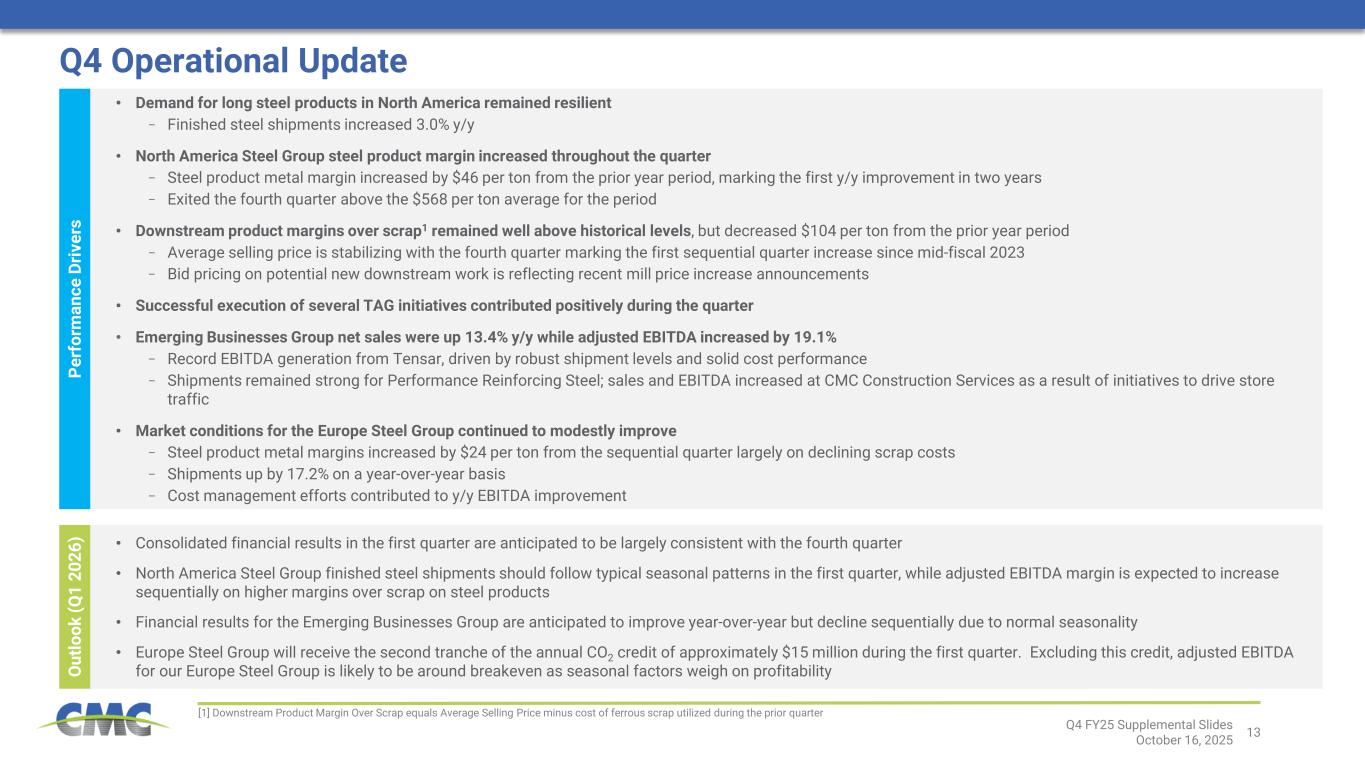 12 Q4 FY25 Supplemental Slides October 16, 2025 Demand Factors Recent Market Developments • Increased inflows of EU funds − Funding amount equal to roughly 3.5% of Polish GDP − Expected to support highway, rail, and energy investment programs • Major projects entering market, including nuclear power generation and national transportation projects • Polish economic growth accelerated in CY 2025 and should maintain momentum in CY 2026 • German proposal to enact €500 billion stimulus package to fund infrastructure and defense investment Supply Factors • Trade policy adjustments proposed by the European Commission would reduce tariff-free import quotas by nearly 50%. Import volumes above the quota would be subject to 50% tariffs. Once approved, the new policy would take effect in July 2026 • Some regional capacity temporarily idled Green Shoots Continue to Emerge for Our Europe Steel Group Market conditions have improved modestly in recent quarters. Emerging green shoots point to further strengthening ahead.