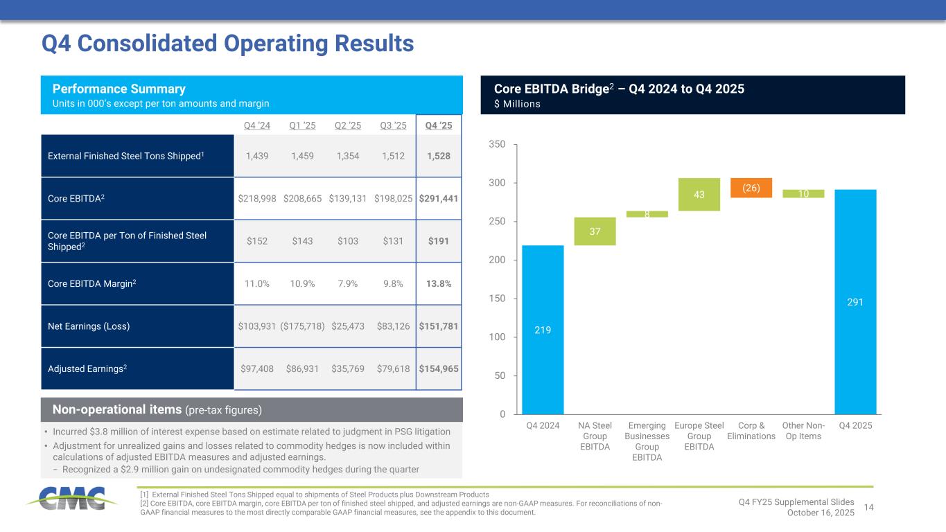 13 • Consolidated financial results in the first quarter are anticipated to be largely consistent with the fourth quarter • North America Steel Group finished steel shipments should follow typical seasonal patterns in the first quarter, while adjusted EBITDA margin is expected to increase sequentially on higher margins over scrap on steel products • Financial results for the Emerging Businesses Group are anticipated to improve year-over-year but decline sequentially due to normal seasonality • Europe Steel Group will receive the second tranche of the annual CO2 credit of approximately $15 million during the first quarter. Excluding this credit, adjusted EBITDA for our Europe Steel Group is likely to be around breakeven as seasonal factors weigh on profitability • Demand for long steel products in North America remained resilient − Finished steel shipments increased 3.0% y/y • North America Steel Group steel product margin increased throughout the quarter − Steel product metal margin increased by $46 per ton from the prior year period, marking the first y/y improvement in two years − Exited the fourth quarter above the $568 per ton average for the period • Downstream product margins over scrap1 remained well above historical levels, but decreased $104 per ton from the prior year period − Average selling price is stabilizing with the fourth quarter marking the first sequential quarter increase since mid-fiscal 2023 − Bid pricing on potential new downstream work is reflecting recent mill price increase announcements • Successful execution of several TAG initiatives contributed positively during the quarter • Emerging Businesses Group net sales were up 13.4% y/y while adjusted EBITDA increased by 19.1% − Record EBITDA generation from Tensar, driven by robust shipment levels and solid cost performance − Shipments remained strong for Performance Reinforcing Steel; sales and EBITDA increased at CMC Construction Services as a result of initiatives to drive store traffic • Market conditions for the Europe Steel Group continued to modestly improve − Steel product metal margins increased by $24 per ton from the sequential quarter largely on declining scrap costs − Shipments up by 17.2% on a year-over-year basis − Cost management efforts contributed to y/y EBITDA improvement Pe rf or m an ce D riv er s O ut lo ok (Q 1 20 26 ) Q4 Operational Update [1] Downstream Product Margin Over Scrap equals Average Selling Price minus cost of ferrous scrap utilized during the prior quarter Q4 FY25 Supplemental Slides October 16, 2025