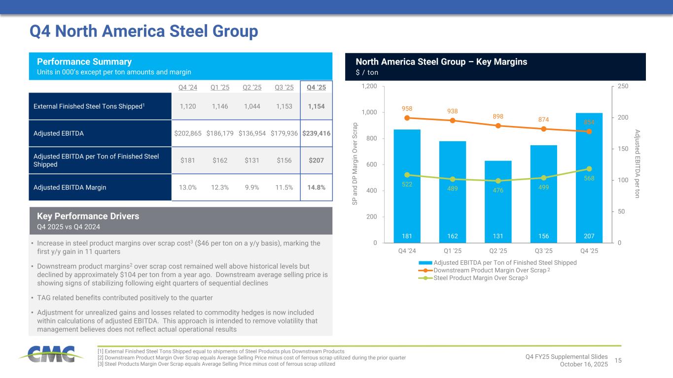 14 219 291 37 8 43 (26) 10 0 50 100 150 200 250 300 350 Q4 2024 NA Steel Group EBITDA Emerging Businesses Group EBITDA Europe Steel Group EBITDA Corp & Eliminations Other Non- Op Items Q4 2025 Q4 Consolidated Operating Results Q4 ’24 Q1 ’25 Q2 ’25 Q3 ’25 Q4 ’25 External Finished Steel Tons Shipped1 1,439 1,459 1,354 1,512 1,528 Core EBITDA2 $218,998 $208,665 $139,131 $198,025 $291,441 Core EBITDA per Ton of Finished Steel Shipped2 $152 $143 $103 $131 $191 Core EBITDA Margin2 11.0% 10.9% 7.9% 9.8% 13.8% Net Earnings (Loss) $103,931 ($175,718) $25,473 $83,126 $151,781 Adjusted Earnings2 $97,408 $86,931 $35,769 $79,618 $154,965 Performance Summary Units in 000’s except per ton amounts and margin • Incurred $3.8 million of interest expense based on estimate related to judgment in PSG litigation • Adjustment for unrealized gains and losses related to commodity hedges is now included within calculations of adjusted EBITDA measures and adjusted earnings. − Recognized a $2.9 million gain on undesignated commodity hedges during the quarter Non-operational items (pre-tax figures) [1] External Finished Steel Tons Shipped equal to shipments of Steel Products plus Downstream Products [2] Core EBITDA, core EBITDA margin, core EBITDA per ton of finished steel shipped, and adjusted earnings are non-GAAP measures. For reconciliations of non- GAAP financial measures to the most directly comparable GAAP financial measures, see the appendix to this document. Core EBITDA Bridge2 – Q4 2024 to Q4 2025 $ Millions Q4 FY25 Supplemental Slides October 16, 2025