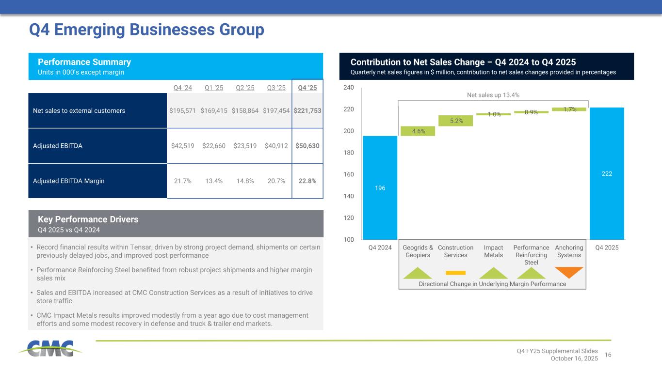 15 181 162 131 156 207 958 938 898 874 854 522 489 476 499 568 0 50 100 150 200 250 0 200 400 600 800 1,000 1,200 Q4 '24 Q1 '25 Q2 '25 Q3 '25 Q4 '25 Adjusted EBITDA per Ton of Finished Steel Shipped Downstream Product Margin Over Scrap Steel Product Margin Over Scrap Q4 North America Steel Group Q4 ’24 Q1 ’25 Q2 ’25 Q3 ’25 Q4 ’25 External Finished Steel Tons Shipped1 1,120 1,146 1,044 1,153 1,154 Adjusted EBITDA $202,865 $186,179 $136,954 $179,936 $239,416 Adjusted EBITDA per Ton of Finished Steel Shipped $181 $162 $131 $156 $207 Adjusted EBITDA Margin 13.0% 12.3% 9.9% 11.5% 14.8% Performance Summary Units in 000’s except per ton amounts and margin • Increase in steel product margins over scrap cost3 ($46 per ton on a y/y basis), marking the first y/y gain in 11 quarters • Downstream product margins2 over scrap cost remained well above historical levels but declined by approximately $104 per ton from a year ago. Downstream average selling price is showing signs of stabilizing following eight quarters of sequential declines • TAG related benefits contributed positively to the quarter • Adjustment for unrealized gains and losses related to commodity hedges is now included within calculations of adjusted EBITDA. This approach is intended to remove volatility that management believes does not reflect actual operational results [1] External Finished Steel Tons Shipped equal to shipments of Steel Products plus Downstream Products [2] Downstream Product Margin Over Scrap equals Average Selling Price minus cost of ferrous scrap utilized during the prior quarter [3] Steel Products Margin Over Scrap equals Average Selling Price minus cost of ferrous scrap utilized Q4 FY25 Supplemental Slides October 16, 2025 North America Steel Group – Key Margins $ / ton SP a nd D P M ar gi n O ve r S cr ap Adjusted EBITDA per ton 2 3 Key Performance Drivers Q4 2025 vs Q4 2024
