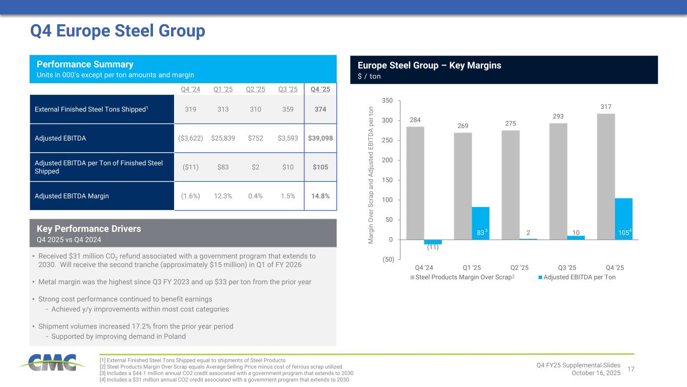 17 284 269 275 293 317 (11) 83 2 10 105 (50) 0 50 100 150 200 250 300 350 Q4 '24 Q1 '25 Q2 '25 Q3 '25 Q4 '25 Steel Products Margin Over Scrap Adjusted EBITDA per Ton Q4 Europe Steel Group Q4 ’24 Q1 ’25 Q2 ’25 Q3 ’25 Q4 ’25 External Finished Steel Tons Shipped1 319 313 310 359 374 Adjusted EBITDA ($3,622) $25,839 $752 $3,593 $39,098 Adjusted EBITDA per Ton of Finished Steel Shipped ($11) $83 $2 $10 $105 Adjusted EBITDA Margin (1.6%) 12.3% 0.4% 1.5% 14.8% • Received $31 million CO2 refund associated with a government program that extends to 2030. Will receive the second tranche (approximately $15 million) in Q1 of FY 2026 • Metal margin was the highest since Q3 FY 2023 and up $33 per ton from the prior year • Strong cost performance continued to benefit earnings − Achieved y/y improvements within most cost categories • Shipment volumes increased 17.2% from the prior year period − Supported by improving demand in Poland [1] External Finished Steel Tons Shipped equal to shipments of Steel Products [2] Steel Products Margin Over Scrap equals Average Selling Price minus cost of ferrous scrap utilized [3] Includes a $44.1 million annual CO2 credit associated with a government program that extends to 2030 [4] Includes a $31 million annual CO2 credit associated with a government program that extends to 2030 2 M ar gi n O ve r S cr ap a nd A dj us te d EB IT DA p er to n Q4 FY25 Supplemental Slides October 16, 2025 Performance Summary Units in 000’s except per ton amounts and margin Key Performance Drivers Q4 2025 vs Q4 2024 Europe Steel Group – Key Margins $ / ton 3 4