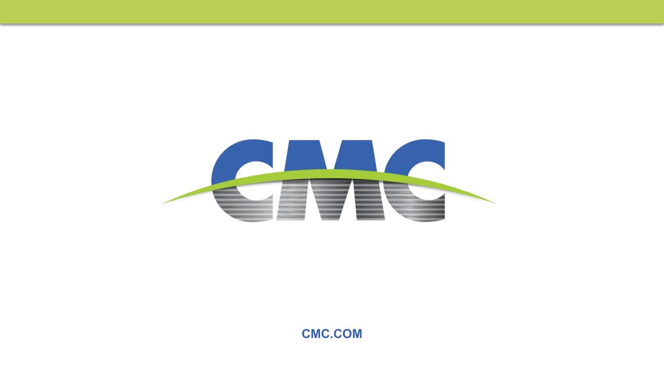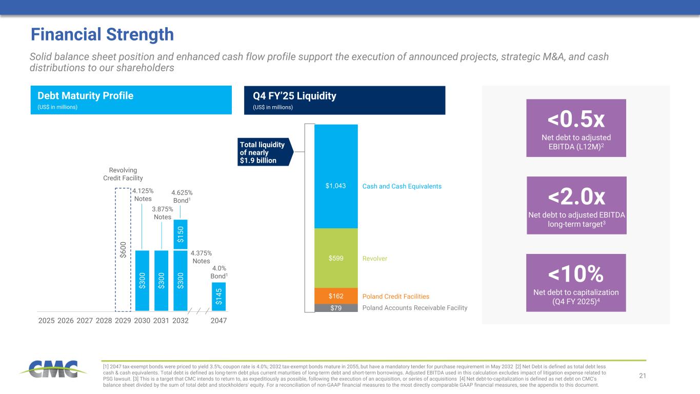 21 $79 $162 $599 $1,043 $3 00 $3 00 $3 00 $1 45 $6 00 $1 50 2025 2026 2027 2028 2029 2030 2031 2032 2047 Financial Strength [1] 2047 tax-exempt bonds were priced to yield 3.5%; coupon rate is 4.0%; 2032 tax-exempt bonds mature in 2055, but have a mandatory tender for purchase requirement in May 2032 [2] Net Debt is defined as total debt less cash & cash equivalents. Total debt is defined as long-term debt plus current maturities of long-term debt and short-term borrowings. Adjusted EBITDA used in this calculation excludes impact of litigation expense related to PSG lawsuit. [3] This is a target that CMC intends to return to, as expeditiously as possible, following the execution of an acquisition, or series of acquisitions [4] Net debt-to-capitalization is defined as net debt on CMC's balance sheet divided by the sum of total debt and stockholders' equity. For a reconciliation of non-GAAP financial measures to the most directly comparable GAAP financial measures, see the appendix to this document. Revolver Poland Credit Facilities (US$ in millions) Revolving Credit Facility 4.125% Notes Cash and Cash Equivalents 3.875% Notes Solid balance sheet position and enhanced cash flow profile support the execution of announced projects, strategic M&A, and cash distributions to our shareholders Debt Maturity Profile Q4 FY’25 Liquidity (US$ in millions) 4.375% Notes 4.0% Bond1 Poland Accounts Receivable Facility <0.5x Net debt to adjusted EBITDA (L12M)2 <2.0x Net debt to adjusted EBITDA long-term target3 <10% Net debt to capitalization (Q4 FY 2025)4 Total liquidity of nearly $1.9 billion 4.625% Bond1