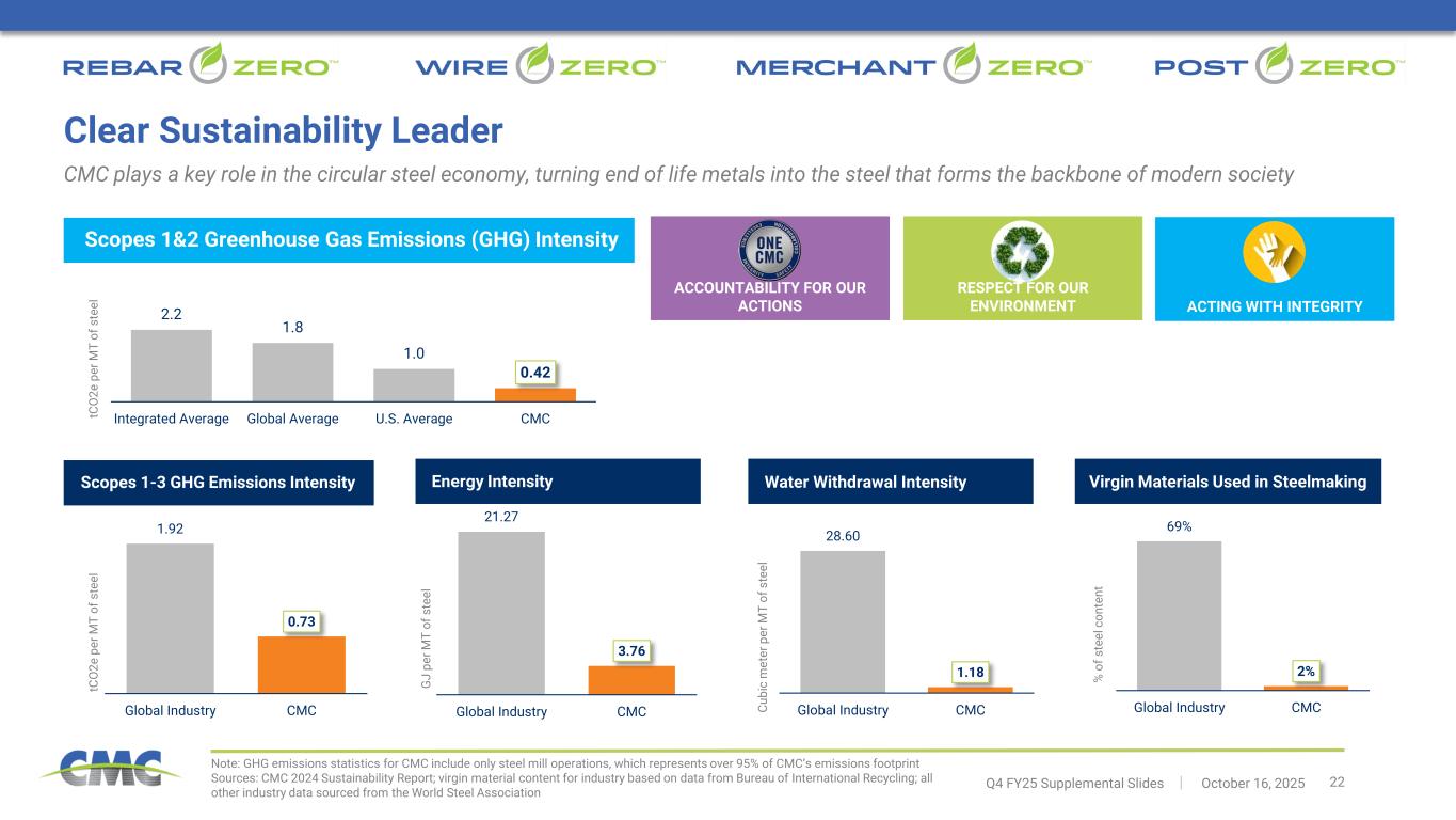 22Q4 FY25 Supplemental Slides │ October 16, 2025 Note: GHG emissions statistics for CMC include only steel mill operations, which represents over 95% of CMC’s emissions footprint Sources: CMC 2024 Sustainability Report; virgin material content for industry based on data from Bureau of International Recycling; all other industry data sourced from the World Steel Association Clear Sustainability Leader CMC plays a key role in the circular steel economy, turning end of life metals into the steel that forms the backbone of modern society Scopes 1&2 Greenhouse Gas Emissions (GHG) Intensity ACCOUNTABILITY FOR OUR ACTIONS RESPECT FOR OUR ENVIRONMENT ACTING WITH INTEGRITY2.2 1.8 1.0 0.42 Integrated Average Global Average U.S. Average CMCtC O 2e p er M T of s te el 1.18 28.60 CMCGlobal Industry 3.76 21.27 CMCGlobal Industry 0.73 1.92 CMCGlobal Industry Energy Intensity G J pe r M T of s te el Water Withdrawal Intensity Cu bi c m et er p er M T of s te el 2% 69% CMCGlobal Industry % o f s te el c on te nt Scopes 1-3 GHG Emissions Intensity tC O 2e p er M T of s te el Virgin Materials Used in Steelmaking