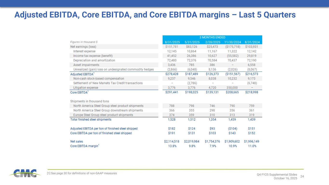 24 [1] See page 30 for definitions of non-GAAP measures Q4 FY25 Supplemental Slides October 16, 2025 Adjusted EBITDA, Core EBITDA, and Core EBITDA margins – Last 5 Quarters