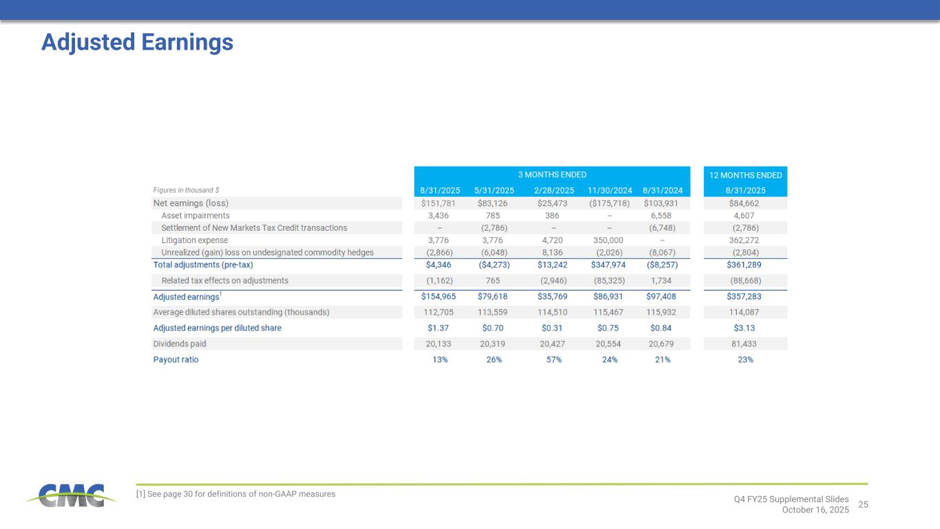 1Q4 FY25 Supplemental Slides October 16, 2025 This presentation contains forward-looking statements within the meaning of the federal securities laws with respect to the proposed acquisitions of Concrete Pipe & Precast ("CP&P") and Foley Products Company ("Foley") and the timing thereof, the ability to obtain regulatory approvals and meet other closing conditions for the proposed acquisitions, the expected benefits of the proposed acquisitions, general economic conditions, key macro-economic drivers that impact our business, the effects of ongoing trade actions, the effects of continued pressure on the liquidity of our customers, potential synergies and growth provided by acquisitions and strategic investments, demand for our products, shipment volumes, metal margins, the ability to operate our steel mills at full capacity particularly during periods of domestic mill start-ups, future availability and cost of supplies of raw materials and energy for our operations, growth rates in certain reportable segments, product margins within our Emerging Businesses Group segment, share repurchases, legal proceedings, construction activity, international trade, the impact of geopolitical conditions, capital expenditures, tax credits, our liquidity and our ability to satisfy future liquidity requirements, estimated contractual obligations, the expected capabilities and benefits of new facilities, anticipated benefits and the timeline for execution of our growth plan and initiatives, including our TAG operational and commercial excellence program, and our expectations or beliefs concerning future events. The statements in this presentation that are not historical statements, are forward-looking statements. These forward-looking statements can generally be identified by phrases such as we or our management “expects,” “anticipates,” “believes,” “estimates,” “future,” “intends,” “may,” “plans to,” “ought,” “could,” “will,” “should,” “likely,” “appears,” “projects,” “forecasts,” “outlook” or other similar words or phrases, as well as by discussions of strategy, plans or intentions. Our forward-looking statements are based on management’s expectations and beliefs as of the date of this presentation. Although we believe that our expectations are reasonable, we can give no assurance that these expectations will prove to have been correct, and actual results may vary materially. Except as required by law, we undertake no obligation to update, amend or clarify any forward-looking statements to reflect changed assumptions, the occurrence of anticipated or unanticipated events, new information or circumstances or any other changes. Important factors that could cause actual results to differ materially from our expectations include those described in our filings with the Securities and Exchange Commission, including, but not limited to, in Part I, Item 1A, “Risk Factors” of our annual report on Form 10-K for the fiscal year ended August 31, 2024 and Part II, Item 1A, "Risk Factors" of our subsequent quarterly reports on Form 10-Q, as well as the following: changes in economic conditions which affect demand for our products or construction activity generally, and the impact of such changes on the highly cyclical steel industry; rapid and significant changes in the price of metals, potentially impairing our inventory values due to declines in commodity prices or reducing the profitability of downstream contracts within our vertically integrated steel operations due to rising commodity pricing; excess capacity in our industry, particularly in China, and product availability from competing steel mills and other steel suppliers including import quantities and pricing; the impact of additional steelmaking capacity expected to come online from a number of electric arc furnace projects in the U.S.; the impact of geopolitical conditions, including political turmoil and volatility, regional conflicts, terrorism and war on the global economy, inflation, energy supplies and raw materials; increased attention to environmental, social and governance (“ESG”) matters, including any targets or other ESG, environmental justice or regulatory initiatives; operating and startup risks, as well as market risks associated with the commissioning of new projects could prevent us from realizing anticipated benefits and could result in a loss of all or a substantial part of our investments; impacts from global public health crises on the economy, demand for our products, global supply chain and on our operations; compliance with and changes in existing and future laws, regulations and other legal requirements and judicial decisions that govern our business, including increased environmental regulations associated with climate change and greenhouse gas emissions; involvement in various environmental matters that may result in fines, penalties or judgments; evolving remediation technology, changing regulations, possible third-party contributions, the inherent uncertainties of the estimation process and other factors that may impact amounts accrued for environmental liabilities; potential limitations in our or our customers' abilities to access credit and non-compliance with their contractual obligations, including payment obligations; activity in repurchasing shares of our common stock under our share repurchase program; financial and non-financial covenants and restrictions on the operation of our business contained in agreements governing our debt; our ability to successfully identify, consummate and integrate acquisitions and realize any or all of the anticipated synergies or other benefits of acquisitions; the effects that acquisitions may have on our financial leverage; risks associated with acquisitions generally, such as the inability to obtain, or delays in obtaining, required approvals under applicable antitrust legislation and other regulatory and third-p