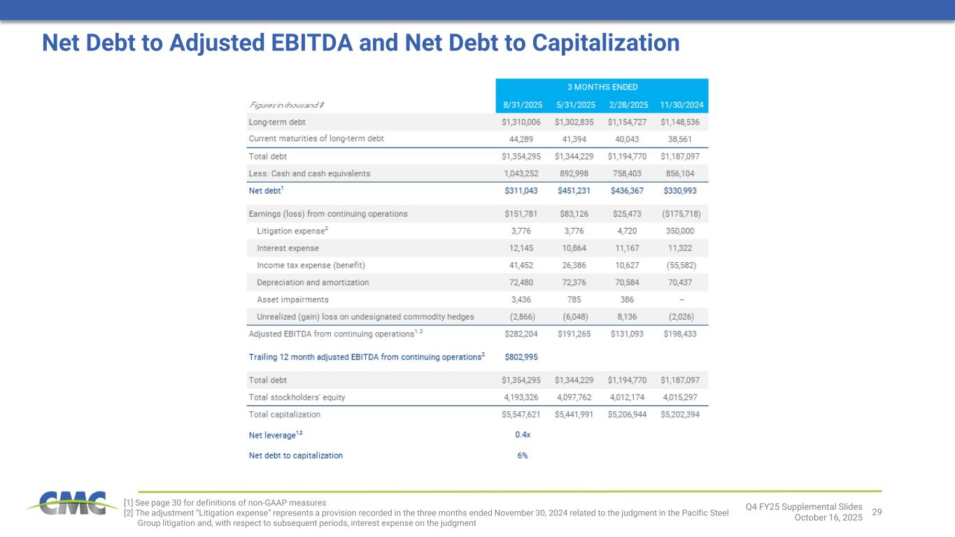 29 [1] See page 30 for definitions of non-GAAP measures [2] The adjustment “Litigation expense” represents a provision recorded in the three months ended November 30, 2024 related to the judgment in the Pacific Steel Group litigation and, with respect to subsequent periods, interest expense on the judgment Q4 FY25 Supplemental Slides October 16, 2025 Net Debt to Adjusted EBITDA and Net Debt to Capitalization