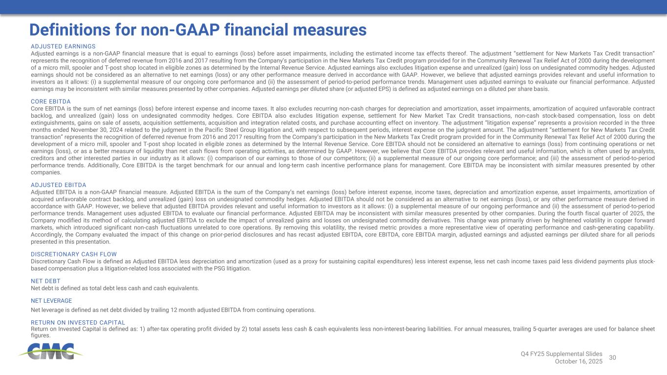 30 ADJUSTED EARNINGS Adjusted earnings is a non-GAAP financial measure that is equal to earnings (loss) before asset impairments, including the estimated income tax effects thereof. The adjustment “settlement for New Markets Tax Credit transaction” represents the recognition of deferred revenue from 2016 and 2017 resulting from the Company’s participation in the New Markets Tax Credit program provided for in the Community Renewal Tax Relief Act of 2000 during the development of a micro mill, spooler and T-post shop located in eligible zones as determined by the Internal Revenue Service. Adjusted earnings also excludes litigation expense and unrealized (gain) loss on undesignated commodity hedges. Adjusted earnings should not be considered as an alternative to net earnings (loss) or any other performance measure derived in accordance with GAAP. However, we believe that adjusted earnings provides relevant and useful information to investors as it allows: (i) a supplemental measure of our ongoing core performance and (ii) the assessment of period-to-period performance trends. Management uses adjusted earnings to evaluate our financial performance. Adjusted earnings may be inconsistent with similar measures presented by other companies. Adjusted earnings per diluted share (or adjusted EPS) is defined as adjusted earnings on a diluted per share basis. CORE EBITDA Core EBITDA is the sum of net earnings (loss) before interest expense and income taxes. It also excludes recurring non-cash charges for depreciation and amortization, asset impairments, amortization of acquired unfavorable contract backlog, and unrealized (gain) loss on undesignated commodity hedges. Core EBITDA also excludes litigation expense, settlement for New Market Tax Credit transactions, non-cash stock-based compensation, loss on debt extinguishments, gains on sale of assets, acquisition settlements, acquisition and integration related costs, and purchase accounting effect on inventory. The adjustment “litigation expense” represents a provision recorded in the three months ended November 30, 2024 related to the judgment in the Pacific Steel Group litigation and, with respect to subsequent periods, interest expense on the judgment amount. The adjustment “settlement for New Markets Tax Credit transaction” represents the recognition of deferred revenue from 2016 and 2017 resulting from the Company’s participation in the New Markets Tax Credit program provided for in the Community Renewal Tax Relief Act of 2000 during the development of a micro mill, spooler and T-post shop located in eligible zones as determined by the Internal Revenue Service. Core EBITDA should not be considered an alternative to earnings (loss) from continuing operations or net earnings (loss), or as a better measure of liquidity than net cash flows from operating activities, as determined by GAAP. However, we believe that Core EBITDA provides relevant and useful information, which is often used by analysts, creditors and other interested parties in our industry as it allows: (i) comparison of our earnings to those of our competitors; (ii) a supplemental measure of our ongoing core performance; and (iii) the assessment of period-to-period performance trends. Additionally, Core EBITDA is the target benchmark for our annual and long-term cash incentive performance plans for management. Core EBITDA may be inconsistent with similar measures presented by other companies. ADJUSTED EBITDA Adjusted EBITDA is a non-GAAP financial measure. Adjusted EBITDA is the sum of the Company’s net earnings (loss) before interest expense, income taxes, depreciation and amortization expense, asset impairments, amortization of acquired unfavorable contract backlog, and unrealized (gain) loss on undesignated commodity hedges. Adjusted EBITDA should not be considered as an alternative to net earnings (loss), or any other performance measure derived in accordance with GAAP. However, we believe that adjusted EBITDA provides relevant and useful information to investors as it allows: (i) a supplemental measure of our ongoing performance and (ii) the assessment of period-to-period performance trends. Management uses adjusted EBITDA to evaluate our financial performance. Adjusted EBITDA may be inconsistent with similar measures presented by other companies. During the fourth fiscal quarter of 2025, the Company modified its method of calculating adjusted EBITDA to exclude the impact of unrealized gains and losses on undesignated commodity derivatives. This change was primarily driven by heightened volatility in copper forward markets, which introduced significant non-cash fluctuations unrelated to core operations. By removing this volatility, the revised metric provides a more representative view of operating performance and cash-generating capability. Accordingly, the Company evaluated the impact of this change on prior-period disclosures and has recast adjusted EBITDA, core EBITDA, core EBITDA margin, adjusted earnings and adjusted earnings per diluted share for all periods presented in this presentation. DISCRETIONARY CASH FLOW Discretionary Cash Flow is defined as Adjusted EBITDA less depreciation and amortization (used as a proxy for sustaining capital expenditures) less interest expense, less net cash income taxes paid less dividend payments plus stock- based compensation plus a litigation-related loss associated with the PSG litigation. NET DEBT Net debt is defined as total debt less cash and cash equivalents. NET LEVERAGE Net leverage is defined as net debt divided by trailing 12 month adjusted EBITDA from continuing operations. RETURN ON INVESTED CAPITAL Return on Invested Capital is defined as: 1) after-tax operating profit divided by 2) total assets less cash & cash equivalents less non-interest-bearing liabilities. For annual measures, trailing 5-quarter averages are used for balance sheet figures. Q4 FY25 Supplemental Slides October 16, 2025 Definitions for non