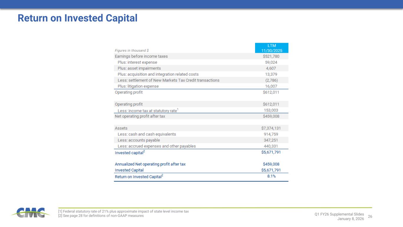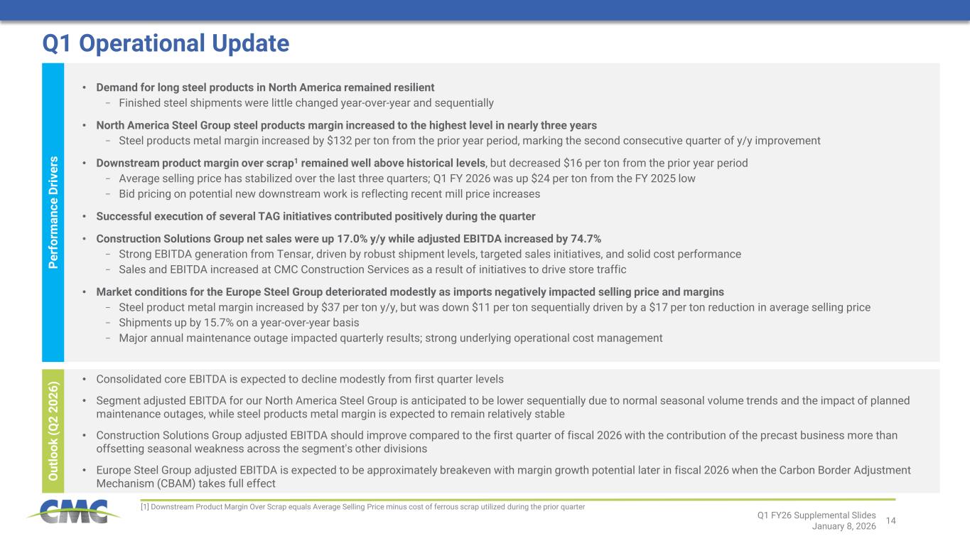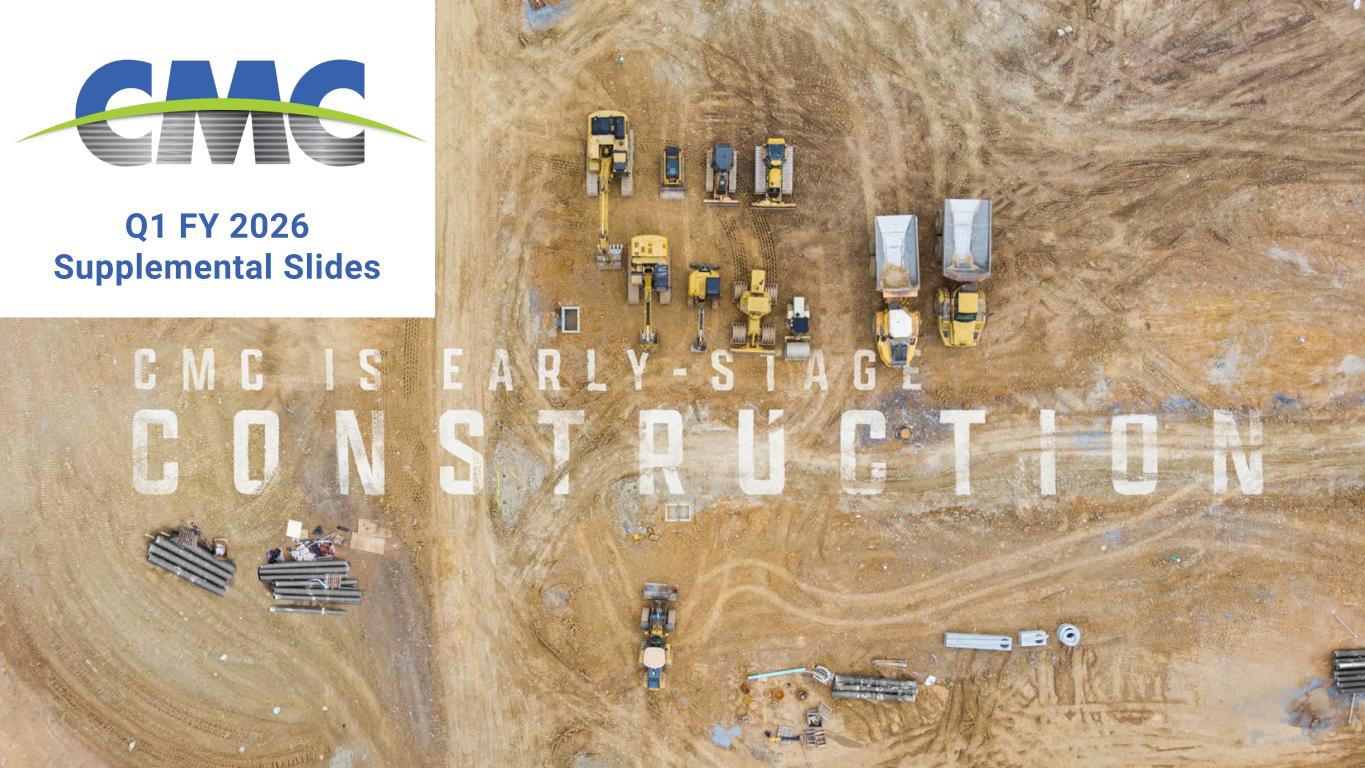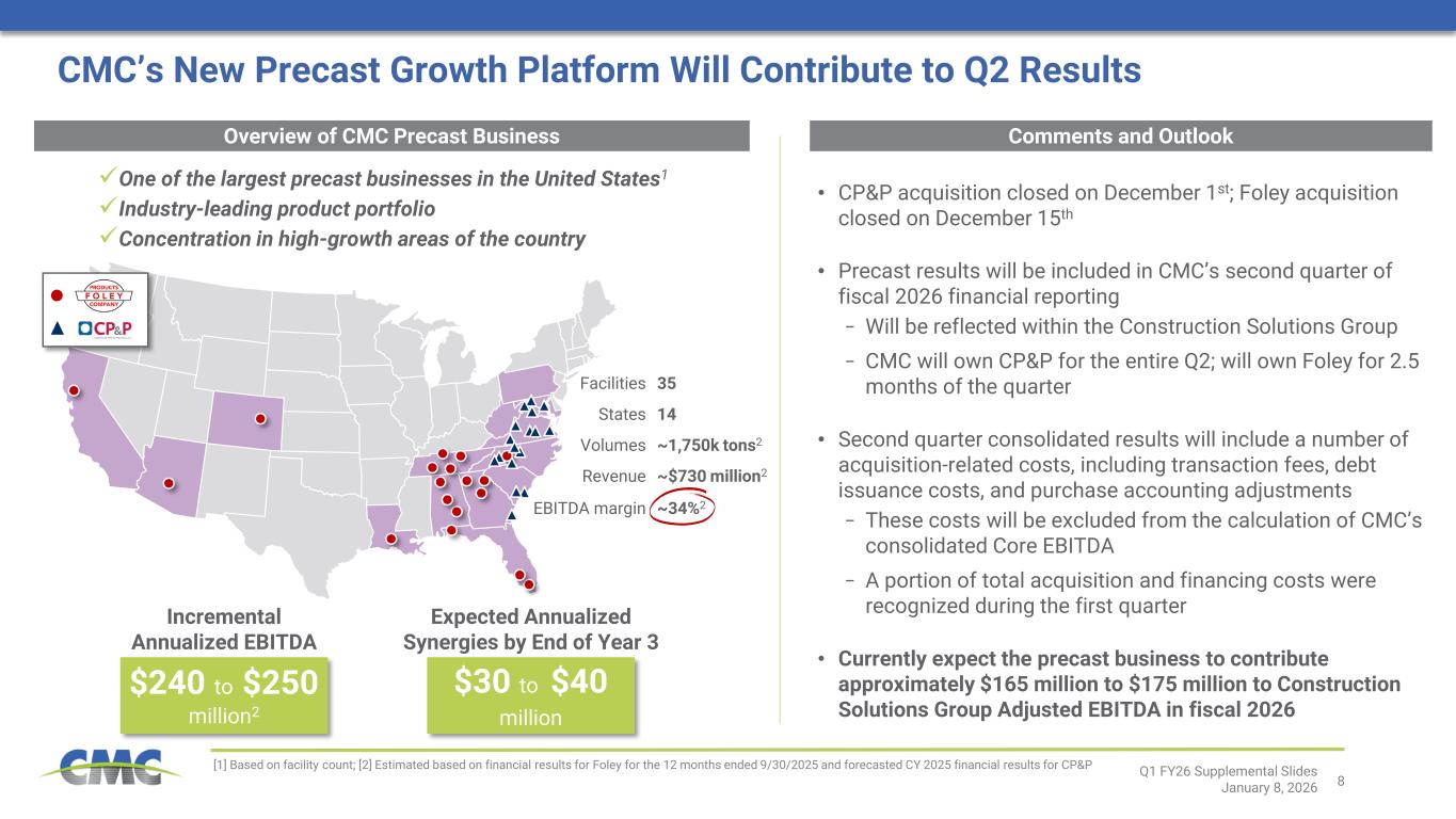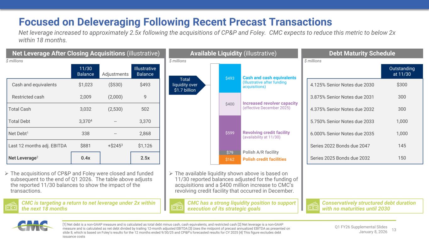 13 Q1 FY26 Supplemental Slides January 8, 2026 Focused on Deleveraging Following Recent Precast Transactions 11/30 Balance Adjustments Illustrative Balance Cash and equivalents $1,023 ($530) $493 Restricted cash 2,009 (2,000) 9 Total Cash 3,032 (2,530) 502 Total Debt 3,3704 -- 3,370 Net Debt1 338 -- 2,868 Last 12 months adj. EBITDA $881 +$2453 $1,126 Net Leverage2 0.4x 2.5x Net Leverage After Closing Acquisitions (illustrative)  The acquisitions of CP&P and Foley were closed and funded subsequent to the end of Q1 2026. The table above adjusts the reported 11/30 balances to show the impact of the transactions. CMC is targeting a return to net leverage under 2x within the next 18 months $ millions Available Liquidity (illustrative) $162 $79 $599 $400 $493 Total liquidity over $1.7 billion  The available liquidity shown above is based on 11/30 reported balances adjusted for the funding of acquisitions and a $400 million increase to CMC’s revolving credit facility that occurred in December. CMC has a strong liquidity position to support execution of its strategic goals Cash and cash equivalents (Illustrative after funding acquisitions) Increased revolver capacity (effective December 2025) Revolving credit facility (availability at 11/30) Polish A/R facility Polish credit facilities Debt Maturity Schedule $ millions Outstanding at 11/30 4.125% Senior Notes due 2030 $300 3.875% Senior Notes due 2031 300 4.375% Senior Notes due 2032 300 5.750% Senior Notes due 2033 1,000 6.000% Senior Notes due 2035 1,000 Series 2022 Bonds due 2047 145 Series 2025 Bonds due 2032 150 Conservatively structured debt duration with no maturities until 2030 Net leverage increased to approximately 2.5x following the acquisitions of CP&P and Foley. CMC expects to reduce this metric to below 2x within 18 months. $ millions [1] Net debt is a non-GAAP measure and is calculated as total debt minus cash, cash equivalents, and restricted cash [2] Net leverage is a non-GAAP measure and is calculated as net debt divided by trailing 12-month adjusted EBITDA [3] Uses the midpoint of precast annualized EBITDA as presented on slide 8, which is based on Foley’s results for the 12 months ended 9/30/25 and CP&P’s forecasted results for CY 2025 [4] This figure excludes debt issuance costs