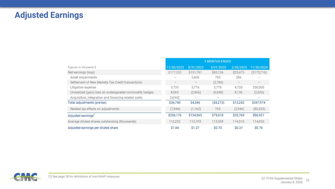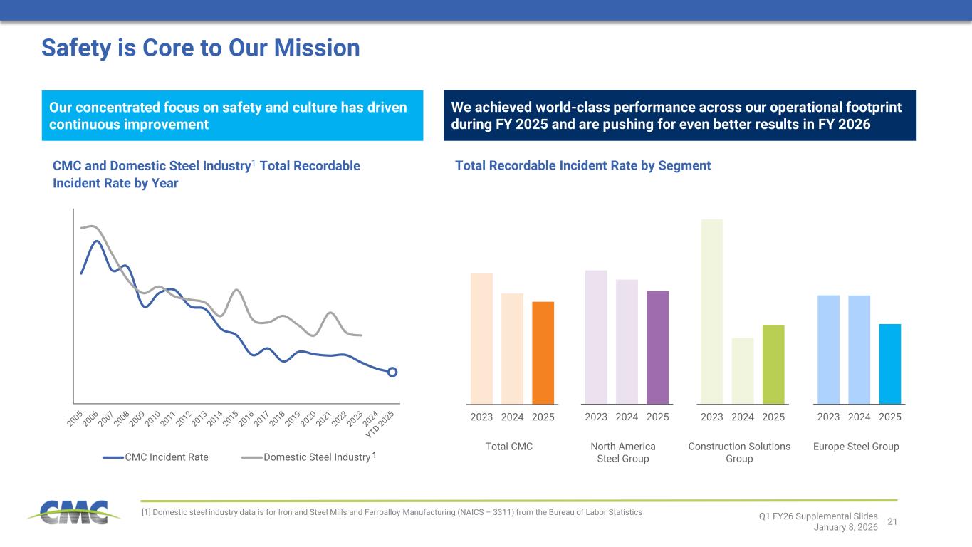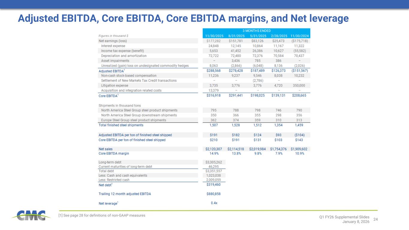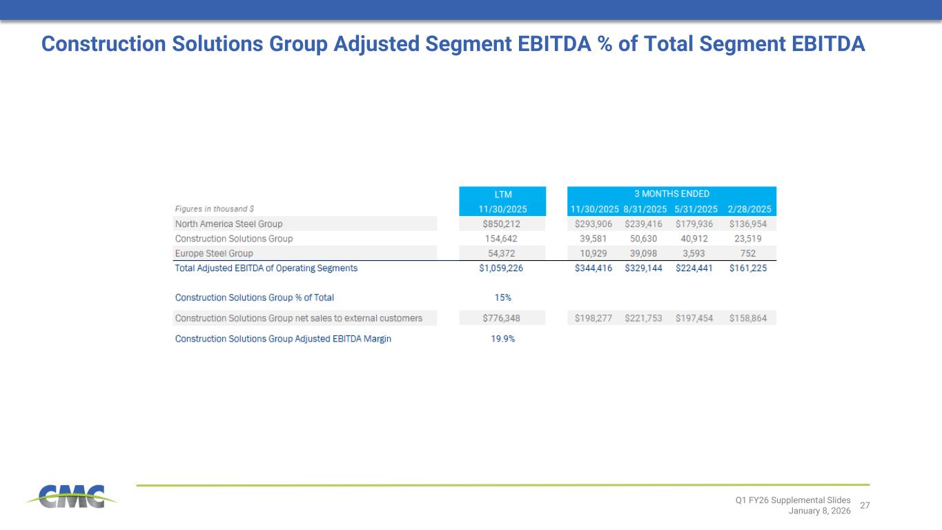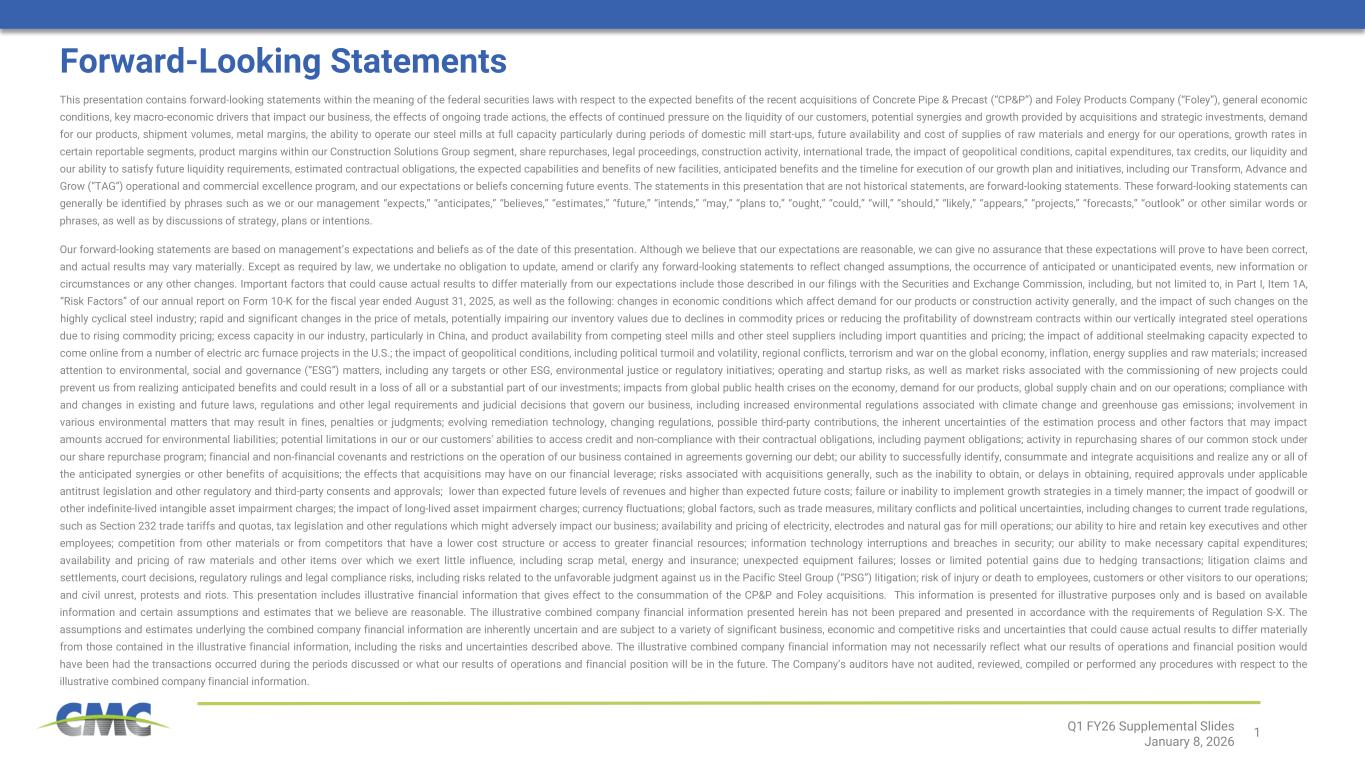 1Q1 FY26 Supplemental Slides January 8, 2026 This presentation contains forward-looking statements within the meaning of the federal securities laws with respect to the expected benefits of the recent acquisitions of Concrete Pipe & Precast (“CP&P”) and Foley Products Company (“Foley”), general economic conditions, key macro-economic drivers that impact our business, the effects of ongoing trade actions, the effects of continued pressure on the liquidity of our customers, potential synergies and growth provided by acquisitions and strategic investments, demand for our products, shipment volumes, metal margins, the ability to operate our steel mills at full capacity particularly during periods of domestic mill start-ups, future availability and cost of supplies of raw materials and energy for our operations, growth rates in certain reportable segments, product margins within our Construction Solutions Group segment, share repurchases, legal proceedings, construction activity, international trade, the impact of geopolitical conditions, capital expenditures, tax credits, our liquidity and our ability to satisfy future liquidity requirements, estimated contractual obligations, the expected capabilities and benefits of new facilities, anticipated benefits and the timeline for execution of our growth plan and initiatives, including our Transform, Advance and Grow (“TAG”) operational and commercial excellence program, and our expectations or beliefs concerning future events. The statements in this presentation that are not historical statements, are forward-looking statements. These forward-looking statements can generally be identified by phrases such as we or our management “expects,” “anticipates,” “believes,” “estimates,” “future,” “intends,” “may,” “plans to,” “ought,” “could,” “will,” “should,” “likely,” “appears,” “projects,” “forecasts,” “outlook” or other similar words or phrases, as well as by discussions of strategy, plans or intentions. Our forward-looking statements are based on management’s expectations and beliefs as of the date of this presentation. Although we believe that our expectations are reasonable, we can give no assurance that these expectations will prove to have been correct, and actual results may vary materially. Except as required by law, we undertake no obligation to update, amend or clarify any forward-looking statements to reflect changed assumptions, the occurrence of anticipated or unanticipated events, new information or circumstances or any other changes. Important factors that could cause actual results to differ materially from our expectations include those described in our filings with the Securities and Exchange Commission, including, but not limited to, in Part I, Item 1A, “Risk Factors” of our annual report on Form 10-K for the fiscal year ended August 31, 2025, as well as the following: changes in economic conditions which affect demand for our products or construction activity generally, and the impact of such changes on the highly cyclical steel industry; rapid and significant changes in the price of metals, potentially impairing our inventory values due to declines in commodity prices or reducing the profitability of downstream contracts within our vertically integrated steel operations due to rising commodity pricing; excess capacity in our industry, particularly in China, and product availability from competing steel mills and other steel suppliers including import quantities and pricing; the impact of additional steelmaking capacity expected to come online from a number of electric arc furnace projects in the U.S.; the impact of geopolitical conditions, including political turmoil and volatility, regional conflicts, terrorism and war on the global economy, inflation, energy supplies and raw materials; increased attention to environmental, social and governance (“ESG”) matters, including any targets or other ESG, environmental justice or regulatory initiatives; operating and startup risks, as well as market risks associated with the commissioning of new projects could prevent us from realizing anticipated benefits and could result in a loss of all or a substantial part of our investments; impacts from global public health crises on the economy, demand for our products, global supply chain and on our operations; compliance with and changes in existing and future laws, regulations and other legal requirements and judicial decisions that govern our business, including increased environmental regulations associated with climate change and greenhouse gas emissions; involvement in various environmental matters that may result in fines, penalties or judgments; evolving remediation technology, changing regulations, possible third-party contributions, the inherent uncertainties of the estimation process and other factors that may impact amounts accrued for environmental liabilities; potential limitations in our or our customers' abilities to access credit and non-compliance with their contractual obligations, including payment obligations; activity in repurchasing shares of our common stock under our share repurchase program; financial and non-financial covenants and restrictions on the operation of our business contained in agreements governing our debt; our ability to successfully identify, consummate and integrate acquisitions and realize any or all of the anticipated synergies or other benefits of acquisitions; the effects that acquisitions may have on our financial leverage; risks associated with acquisitions generally, such as the inability to obtain, or delays in obtaining, required approvals under applicable antitrust legislation and other regulatory and third-party consents and approvals; lower than expected future levels of revenues and higher than expected future costs; failure or inability to implement growth strategies in a timely manner; the impact of 