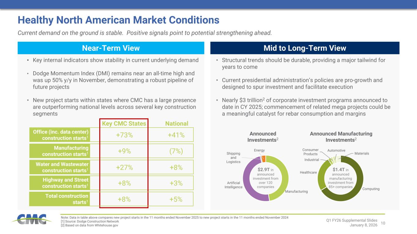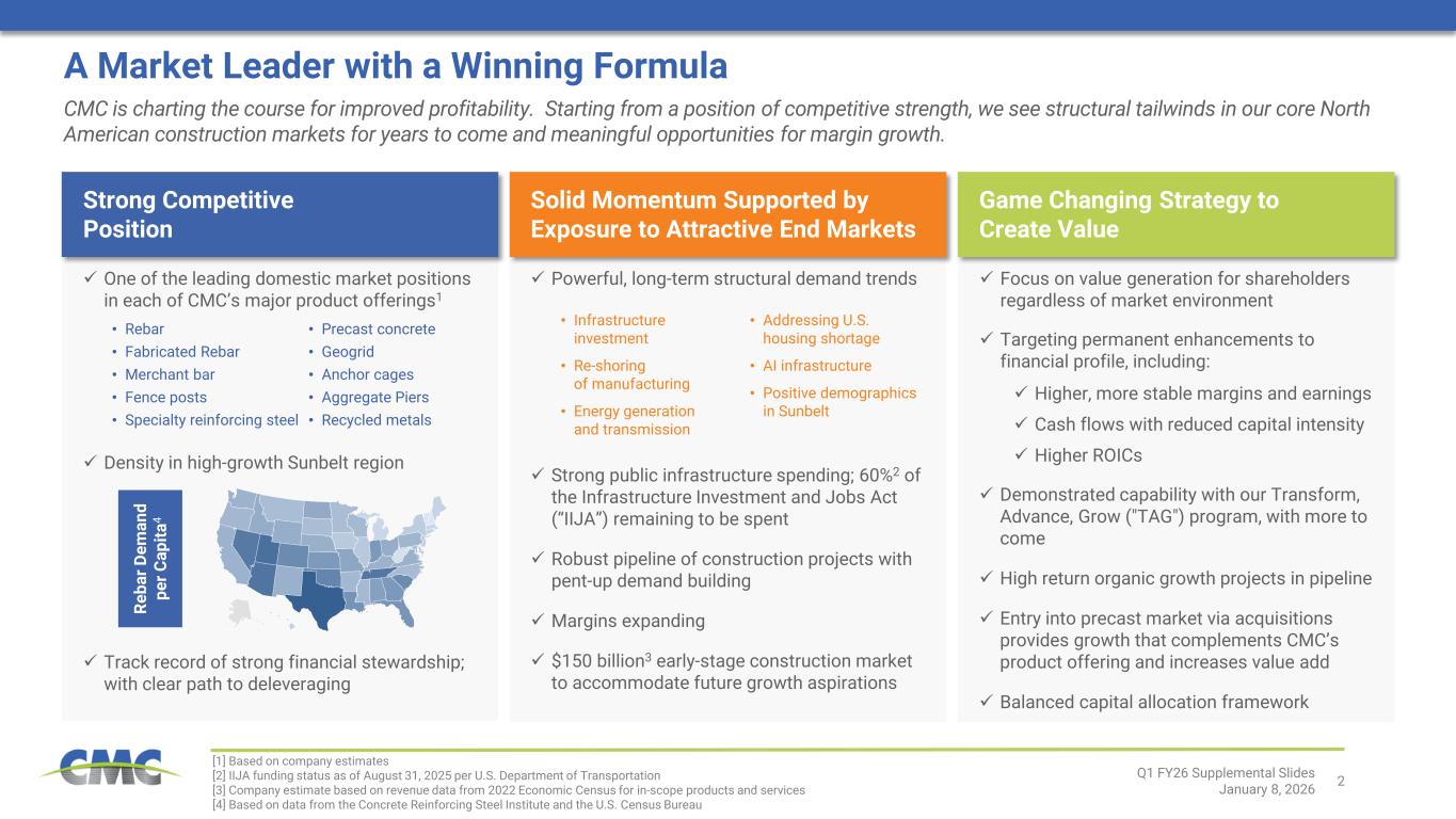 2 © GeoNames, Microsoft, TomTom Powered by Bing A Market Leader with a Winning Formula CMC is charting the course for improved profitability. Starting from a position of competitive strength, we see structural tailwinds in our core North American construction markets for years to come and meaningful opportunities for margin growth. Strong Competitive Position Solid Momentum Supported by Exposure to Attractive End Markets Game Changing Strategy to Create Value  One of the leading domestic market positions in each of CMC’s major product offerings1  Density in high-growth Sunbelt region  Track record of strong financial stewardship; with clear path to deleveraging • Rebar • Fabricated Rebar • Merchant bar • Fence posts • Specialty reinforcing steel • Precast concrete • Geogrid • Anchor cages • Aggregate Piers • Recycled metals Re ba r D em an d pe r C ap ita 4  Powerful, long-term structural demand trends  Strong public infrastructure spending; 60%2 of the Infrastructure Investment and Jobs Act (“IIJA”) remaining to be spent  Robust pipeline of construction projects with pent-up demand building  Margins expanding  $150 billion3 early-stage construction market to accommodate future growth aspirations • Infrastructure investment • Re-shoring of manufacturing • Energy generation and transmission • Addressing U.S. housing shortage • AI infrastructure • Positive demographics in Sunbelt  Focus on value generation for shareholders regardless of market environment  Targeting permanent enhancements to financial profile, including:  Higher, more stable margins and earnings  Cash flows with reduced capital intensity  Higher ROICs Q1 FY26 Supplemental Slides January 8, 2026  Demonstrated capability with our Transform, Advance, Grow ("TAG") program, with more to come  High return organic growth projects in pipeline  Entry into precast market via acquisitions provides growth that complements CMC’s product offering and increases value add  Balanced capital allocation framework [1] Based on company estimates [2] IIJA funding status as of August 31, 2025 per U.S. Department of Transportation [3] Company estimate based on revenue data from 2022 Economic Census for in-scope products and services [4] Based on data from the Concrete Reinforcing Steel Institute and the U.S. Census Bureau