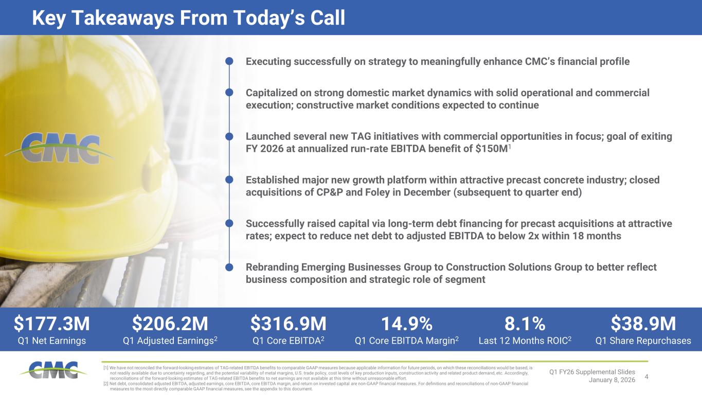 3 Path to Creating Shareholder Value: Running and Growing a Great Business Q1 FY26 Supplemental Slides January 8, 2026 We are aiming for a new level of performance by getting more out of our existing business while investing in value enhancing capabilities Investing in Our People & Pursuing Excellence Value Accretive Organic Growth Capability Enhancing Inorganic Growth 1 2 3  Focus on the safety of our people and building a world-class team  Execute operational and commercial excellence (TAG program) initiatives that drive margin improvement across the enterprise  Achieve sustainably higher, less volatile, through-the-cycle margins  Commission our newest micro mill project to complete our flexible operating network  Invest in automation and process efficiency solutions, including supporting operational and commercial excellence efforts  Invest to support growth in high margin proprietary solutions (e.g., geogrids, proprietary reinforcing steel, precast)  Open large and scalable new growth lanes in $150 billion1 early-stage construction market  Broaden CMC’s portfolio, improve value proposition, and strengthen existing business through expansion of early-stage construction solutions [1] Company estimate based on revenue data from 2022 Economic Census for in-scope products and services