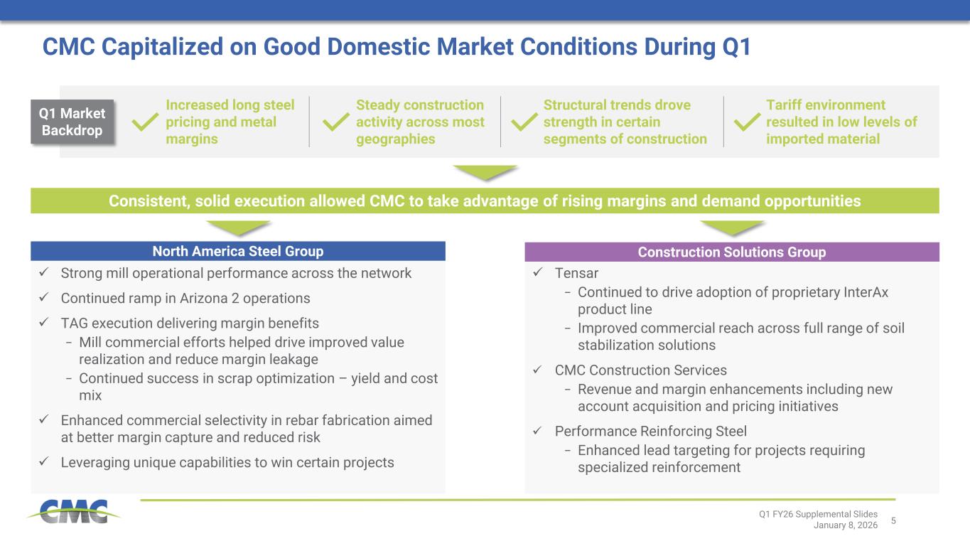 4 [1] We have not reconciled the forward-looking estimates of TAG-related EBITDA benefits to comparable GAAP measures because applicable information for future periods, on which these reconciliations would be based, is not readily available due to uncertainty regarding, and the potential variability of metal margins, U.S. trade policy, cost levels of key production inputs, construction activity and related product demand, etc. Accordingly, reconciliations of the forward-looking estimates of TAG-related EBITDA benefits to net earnings are not available at this time without unreasonable effort. [2] Net debt, consolidated adjusted EBITDA, adjusted earnings, core EBITDA, core EBITDA margin, and return on invested capital are non-GAAP financial measures. For definitions and reconciliations of non-GAAP financial measures to the most directly comparable GAAP financial measures, see the appendix to this document. Executing successfully on strategy to meaningfully enhance CMC’s financial profile Capitalized on strong domestic market dynamics with solid operational and commercial execution; constructive market conditions expected to continue Launched several new TAG initiatives with commercial opportunities in focus; goal of exiting FY 2026 at annualized run-rate EBITDA benefit of $150M1 Established major new growth platform within attractive precast concrete industry; closed acquisitions of CP&P and Foley in December (subsequent to quarter end) Successfully raised capital via long-term debt financing for precast acquisitions at attractive rates; expect to reduce net debt to adjusted EBITDA to below 2x within 18 months Rebranding Emerging Businesses Group to Construction Solutions Group to better reflect business composition and strategic role of segment $177.3M Q1 Net Earnings $206.2M Q1 Adjusted Earnings2 $316.9M Q1 Core EBITDA2 14.9% Q1 Core EBITDA Margin2 8.1% Last 12 Months ROIC2 $38.9M Q1 Share Repurchases Key Takeaways From Today’s Call Q1 FY26 Supplemental Slides January 8, 2026