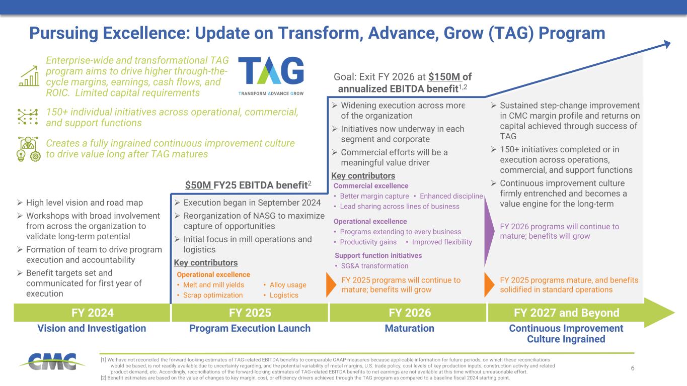 6 $50M FY25 EBITDA benefit2 Goal: Exit FY 2026 at $150M of annualized EBITDA benefit1,2  Widening execution across more of of the organization  Initiatives now underway in each segment and corporate  Commercial efforts will be a meaningful value driver Key contributors  Execution began in September 2024  Reorganization of NASG to maximize capture of opportunities  Initial focus in mill operations and logistics Key contributors Pursuing Excellence: Update on Transform, Advance, Grow (TAG) Program [1] We have not reconciled the forward-looking estimates of TAG-related EBITDA benefits to comparable GAAP measures because applicable information for future periods, on which these reconciliations would be based, is not readily available due to uncertainty regarding, and the potential variability of metal margins, U.S. trade policy, cost levels of key production inputs, construction activity and related product demand, etc. Accordingly, reconciliations of the forward-looking estimates of TAG-related EBITDA benefits to net earnings are not available at this time without unreasonable effort. [2] Benefit estimates are based on the value of changes to key margin, cost, or efficiency drivers achieved through the TAG program as compared to a baseline fiscal 2024 starting point. FY 2024 FY 2025 FY 2026 FY 2027 and Beyond Vision and Investigation Program Execution Launch Maturation Continuous Improvement Culture Ingrained  High level vision and road map  Workshops with broad involvement from across the organization to validate long-term potential  Formation of team to drive program execution and accountability  Benefit targets set and communicated for first year of execution FY 2025 programs will continue to mature; benefits will grow Commercial excellence • Better margin capture • Enhanced discipline • Lead sharing across lines of business Operational excellence • Programs extending to every business • Productivity gains • Improved flexibility Support function initiatives • SG&A transformation FY 2026 programs will continue to mature; benefits will grow FY 2025 programs mature, and benefits solidified in standard operations  Sustained step-change improvement in CMC margin profile and returns on capital achieved through success of TAG  150+ initiatives completed or in execution across operations, commercial, and support functions  Continuous improvement culture firmly entrenched and becomes a value engine for the long-term Enterprise-wide and transformational TAG program aims to drive higher through-the- cycle margins, earnings, cash flows, and ROIC. Limited capital requirements 150+ individual initiatives across operational, commercial, and support functions Creates a fully ingrained continuous improvement culture to drive value long after TAG matures Operational excellence • Melt and mill yields • Alloy usage • Scrap optimization • Logistics
