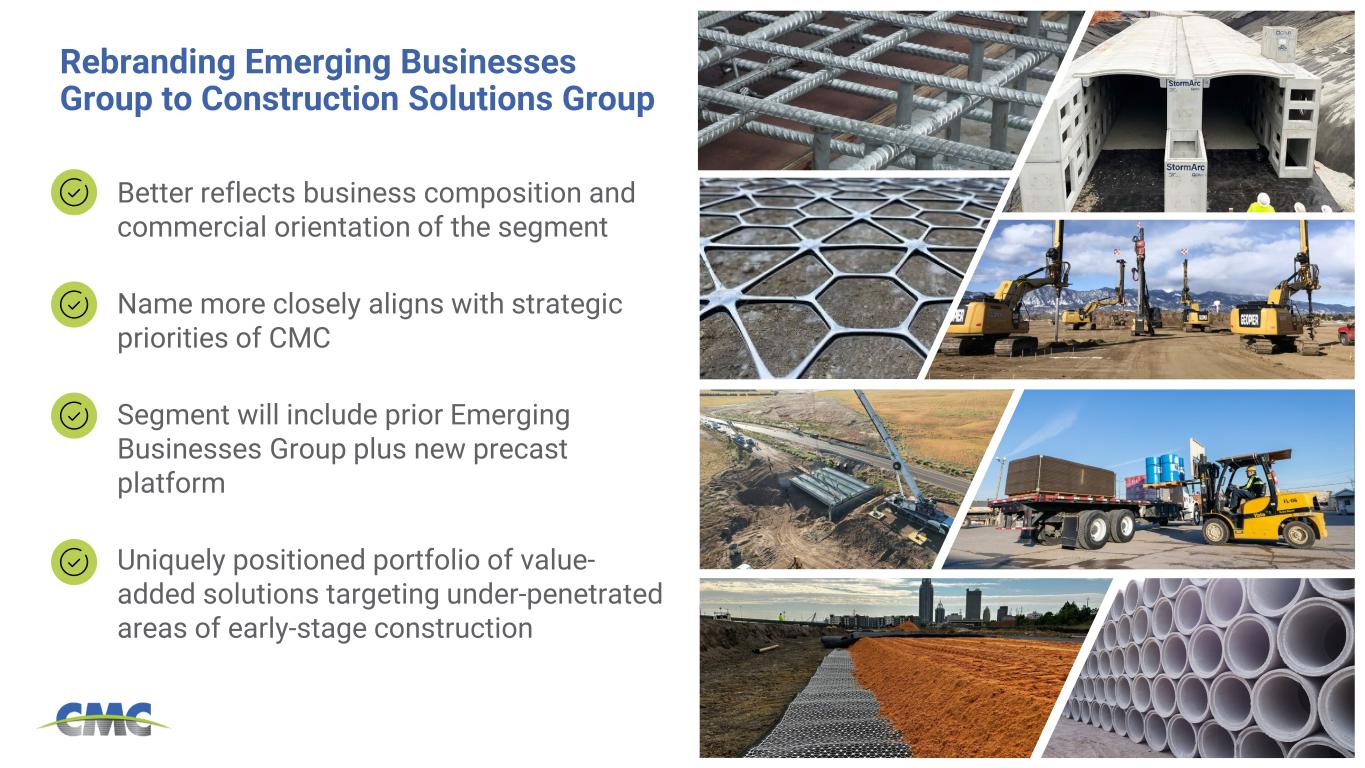 Rebranding Emerging Businesses Group to Construction Solutions Group Better reflects business composition and commercial orientation of the segment Name more closely aligns with strategic priorities of CMC Segment will include prior Emerging Businesses Group plus new precast platform Uniquely positioned portfolio of value- added solutions targeting under-penetrated areas of early-stage construction